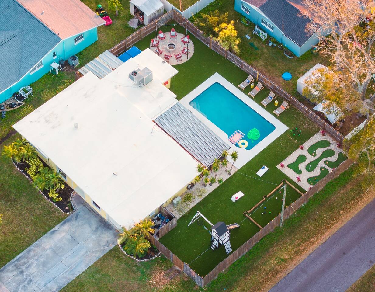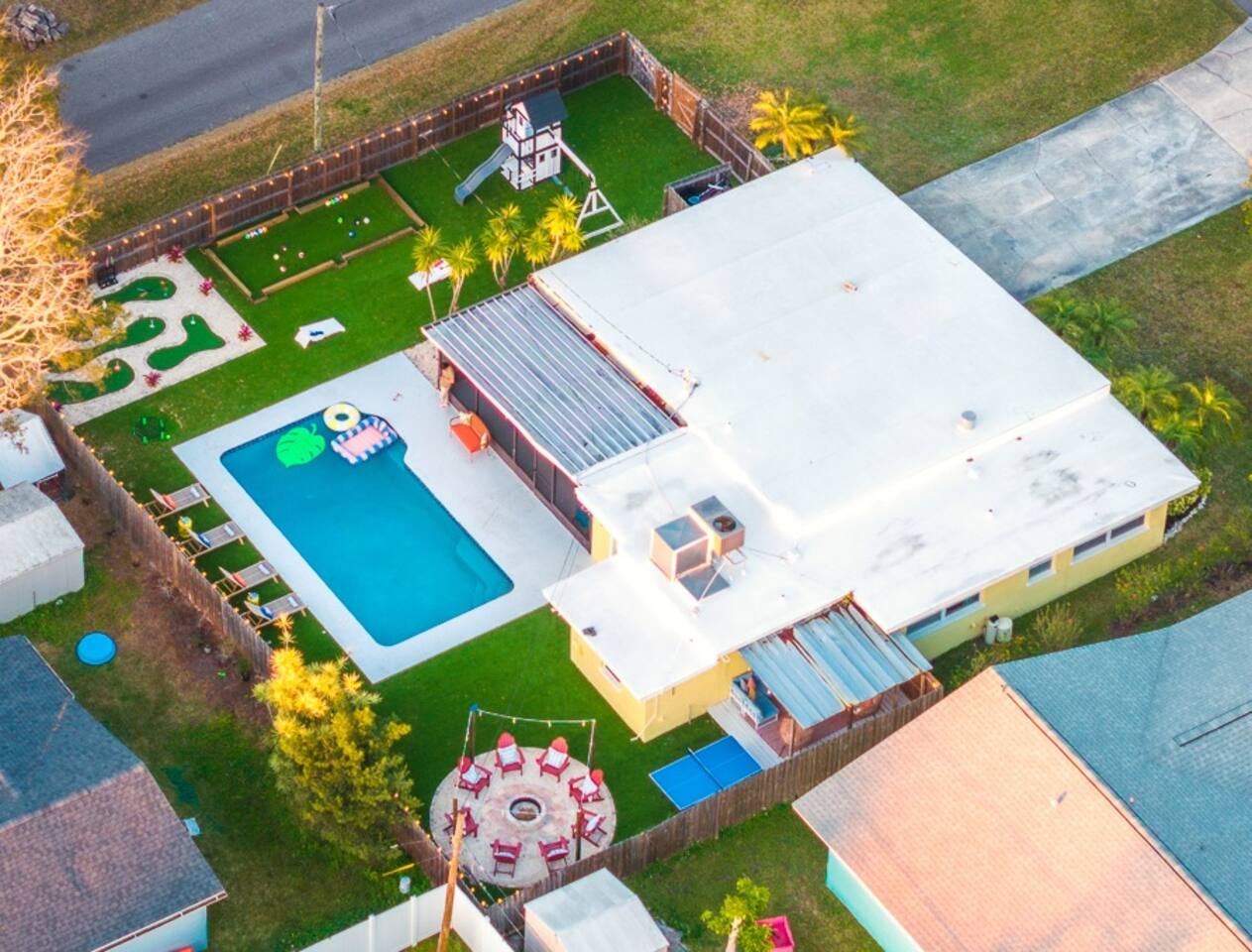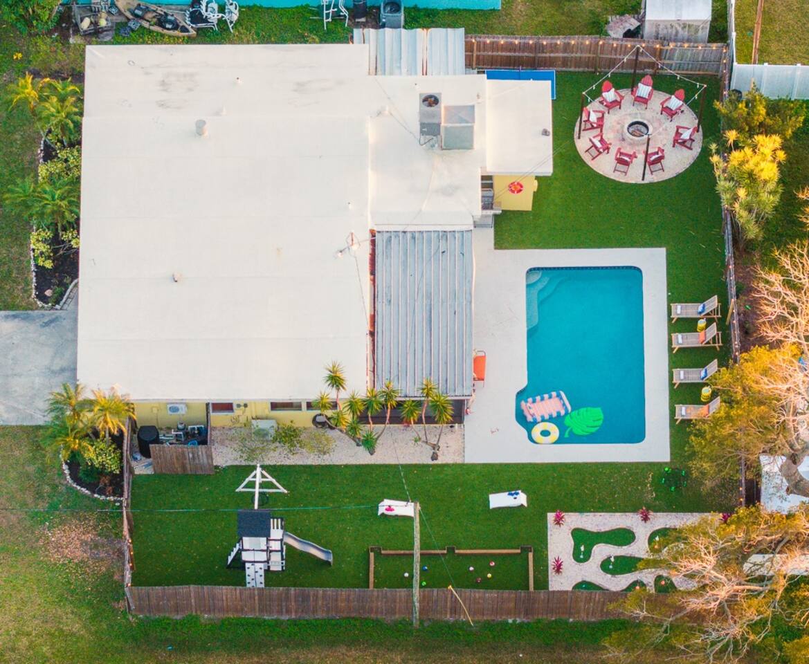 🏡 Our Home Designed for comfort, connection, and easy group stays! • Open-concept living space with Roku Smart TVs throughout • Single-level layout • Fully equipped kitchen with service for 16, including: – Keurig Duo (drip + single K-cup pod) – Tea kettle, blender, and toaster – Full cookware & glassware – Stove, oven & microwave – Paper towels & dish detergent provided • Dining space for group meals • Washing machine & dryer • Iron & ironing board 🛏️ Sleeping Arrangements (Sleeps up to 14 guests) • King bed • Two Queen beds (shares hallway bathroom with King bed bedroom) • Queen bed + Twin-over-Twin bunk with ensuite bathroom • Two Queen beds + mini-split AC & heater Fresh towels, linens, and essentials provided. 🎮 Garage Game Room A fun space for all kids and adults alike: • Pool table • Classic Pac-Man arcade game • Mini-split A/C for comfort 🌴 Backyard Oasis & Outdoor Fun Step outside to your fully fenced private backyard featuring: • Heated concrete pool (4–6 ft depth) (additional fee required, see below) • Standalone hot tub in the lanai • Outdoor dining area seating 10 • Pool loungers • 5-hole putt-putt mini golf • Kick billiards • Ping pong • Cornhole • Giant Jenga • Spikeball • Kids playset • Wood-burning fire pit with adirondack seating • Grill with provided propane tanks • Outdoor Roku-enabled projector in the lanai Pool floats available (2–3 provided). 🏝️ Heated Pool & Hot Tub – Additional Fee Required • Pool heat: $35/day • Hot tub: $25/day • Both: $50/day (applied to entire reservation) 🏖️ Beach & Family Extras Located in the bunk room closet area: • 4–6 beach chairs • Cooler • Wagon • Umbrella • Beach towels • Pack-n-play • High chair 🚗 Parking • Driveway parking for up to 4 vehicles 🐾 Pet Policy • $150 per stay for 1 pet • $50 per each additional pet • Maximum of 2 pets total 📍 Prime Largo Location Conveniently located in a quiet residential neighborhood of Largo. • 4 minutes to Indian Rocks Beach • 20 minutes to Madeira Beach • 20 minutes to Clearwater Beach • 30 minutes to St. Pete-Clearwater International Airport • 40 minutes to Tampa International Airport 📌 House Rules Respecting the space ensures a smooth and enjoyable stay. Violation of these rules may result in immediate cancellation without refund: • Maximum occupancy: 14 guests indoors • Quiet hours: 10 PM – 8 AM (includes outdoor amenities) • No smoking or vaping • No open flames, candles, or matches • Thermostat must remain between 69°F and 78°F • No shoes inside the house – cleaning/replacement fees apply for stains • Use of pool and play equipment is at guest’s own risk • Keep doors and windows closed to prevent pest entry (Florida is a tropical climate!) • Any damage must be reported promptly • Respect neighbors and property at all times 🔒 Security & Monitoring For security purposes only: • Outdoor security cameras (front of home & facing playset - no audio recording) • Minut noise monitoring device (does not record conversations) Neighbors are diligent in reporting violations, so please be respectful of the property, furnishings, and community to ensure a positive stay for everyone. 😊 This home is perfect for families, multi-family trips, and groups looking for a private, fun-packed Florida getaway with space to relax and play. 🌴🔥