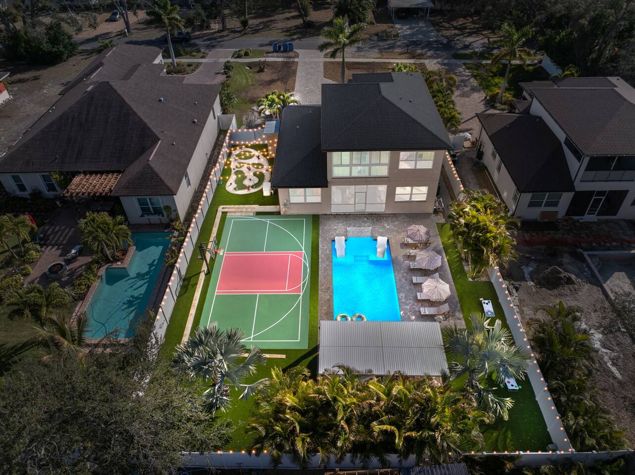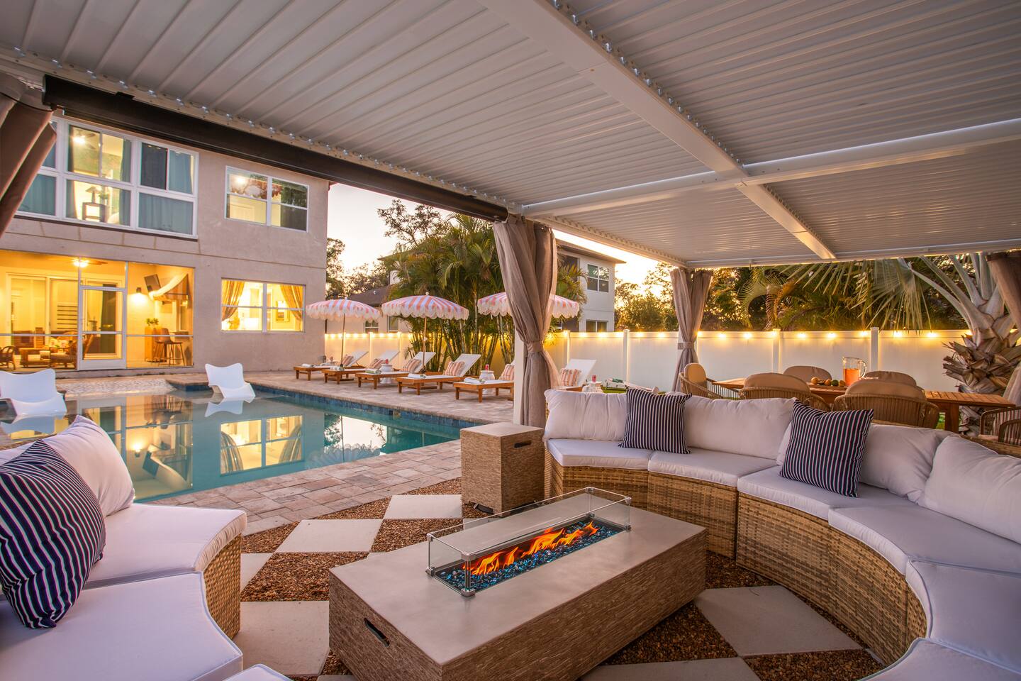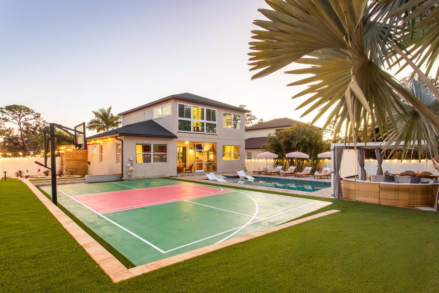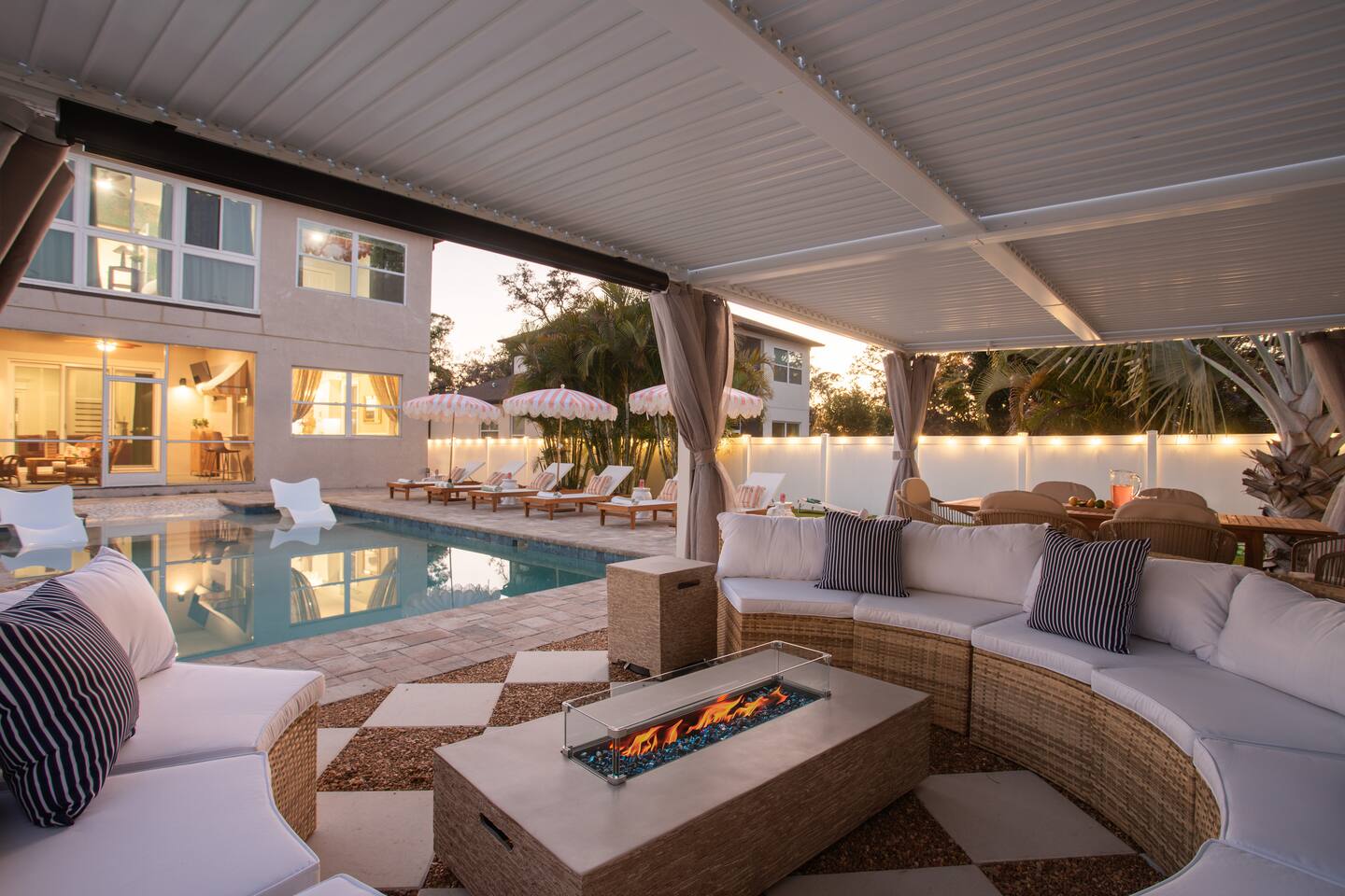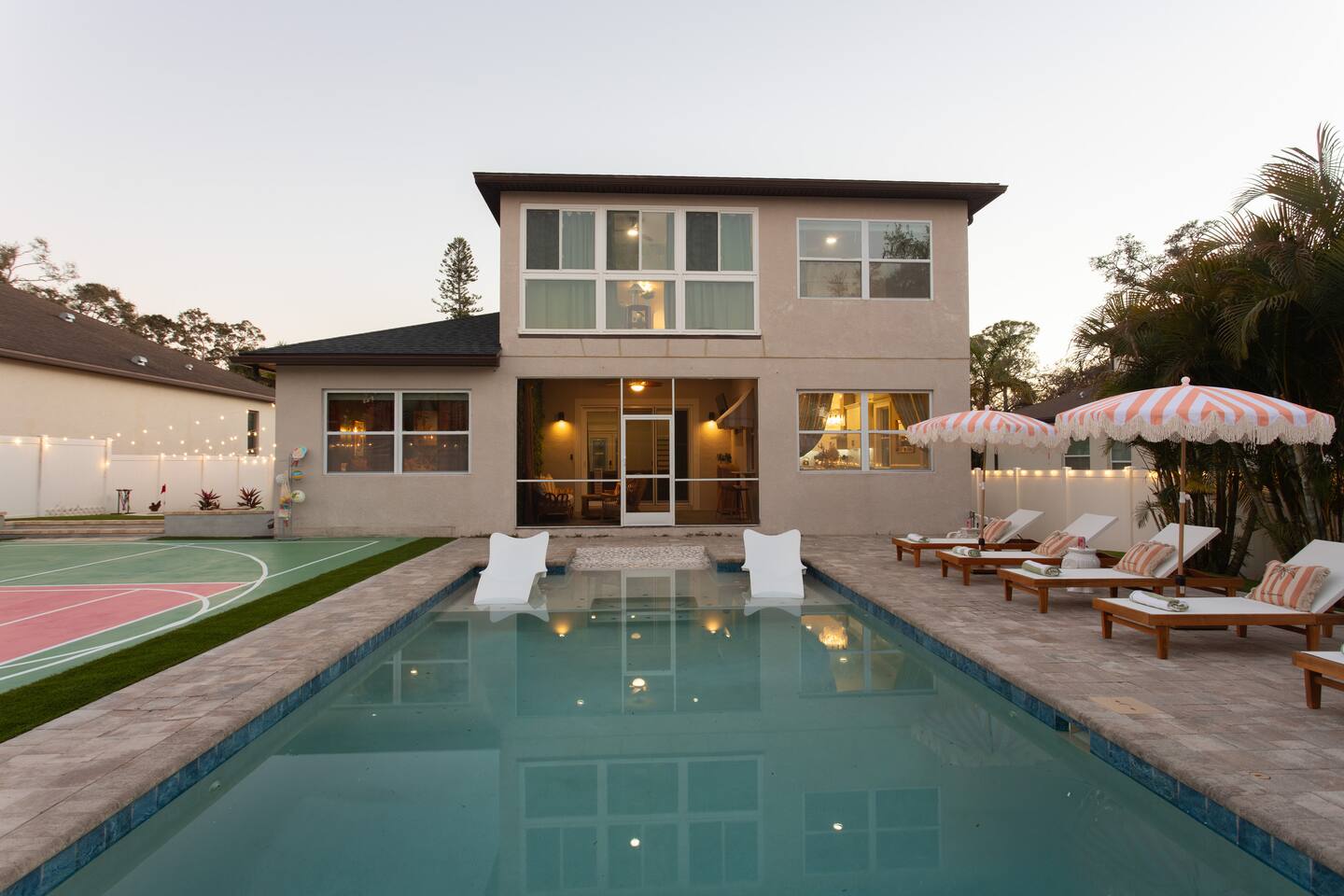 Welcome to The Palm Royale - A Gatsby Coastal Estate. Step into timeless elegance at this spacious two-story retreat. Just minutes from beaches, this home is 4 bedroom, 3.5 baths + a bonus bunkbed area! Spend sun-filled afternoons beside your heated pool, challenge friends to mini golf or pickleball then gather beneath the pergola for cocktails by the fire and outdoor cinema. Inside, the climate-controlled game lounge invites guests to unwind with poker, record spinning, and billiards!