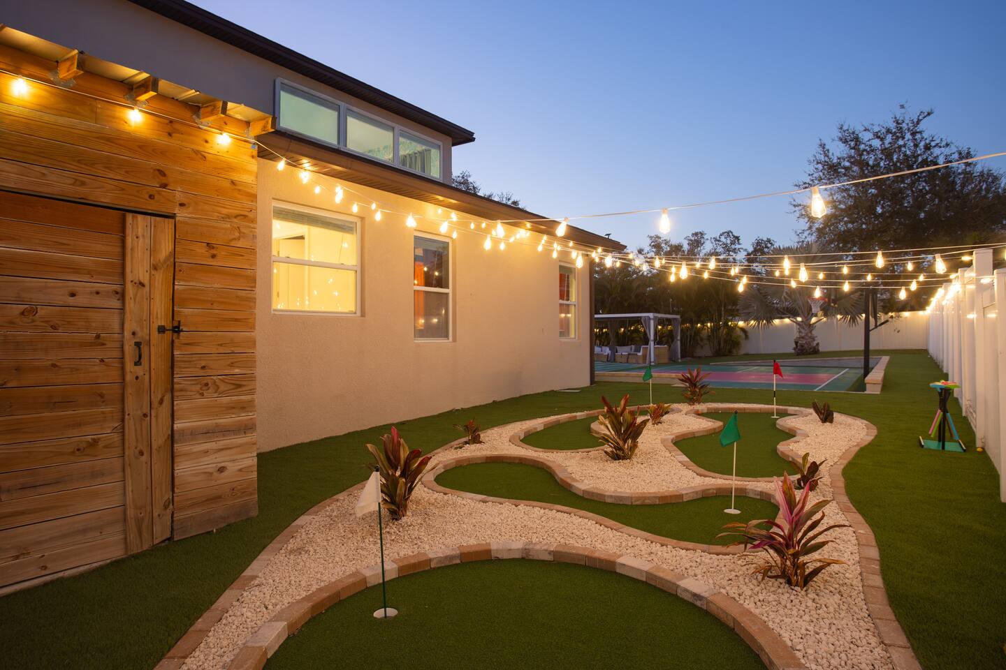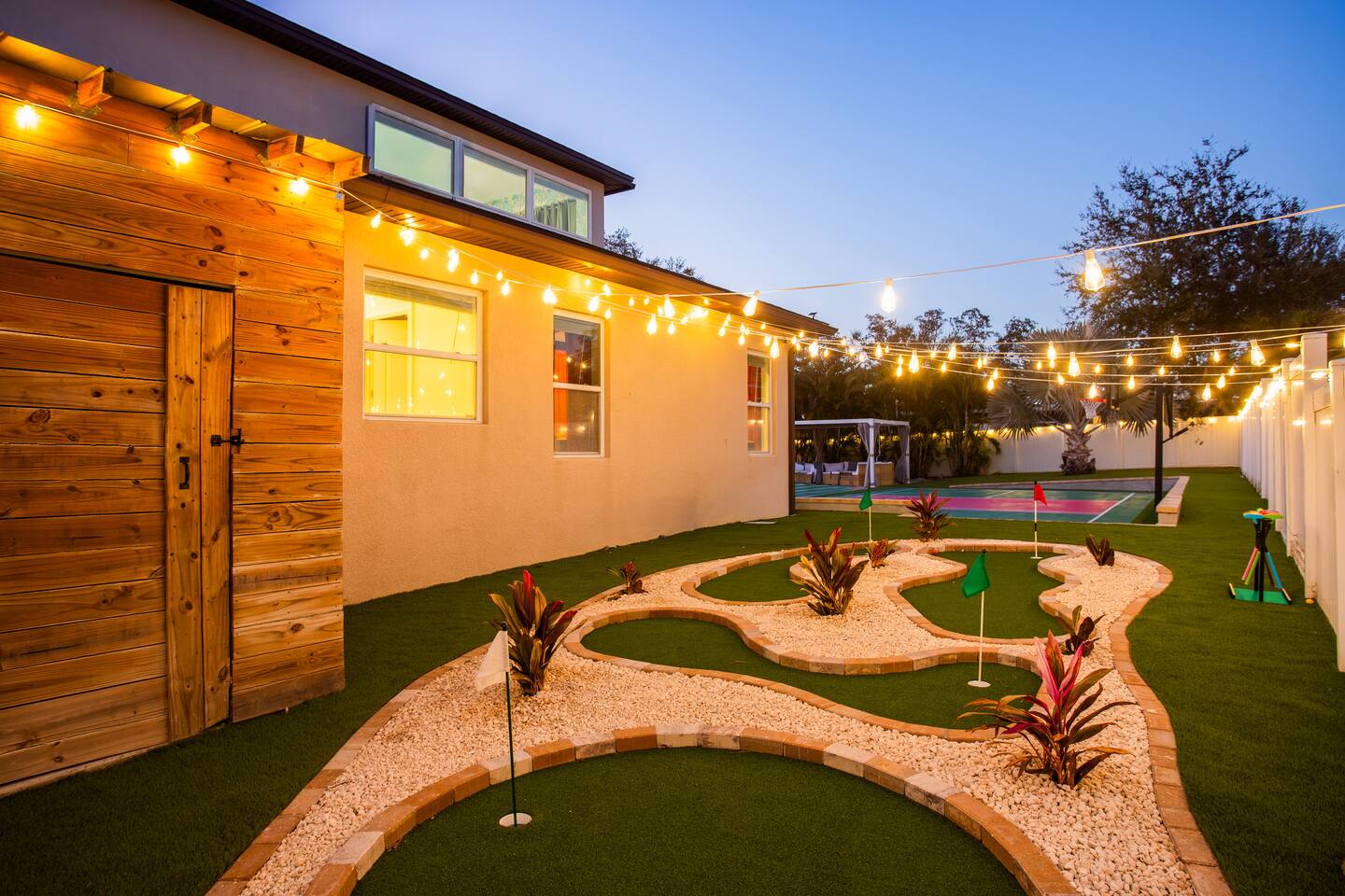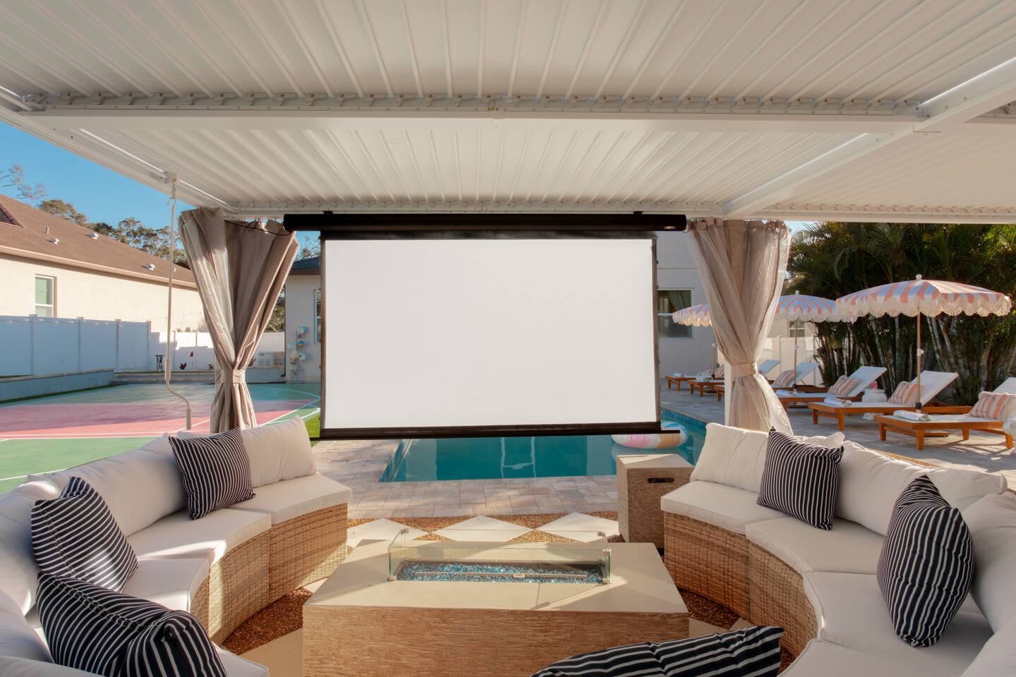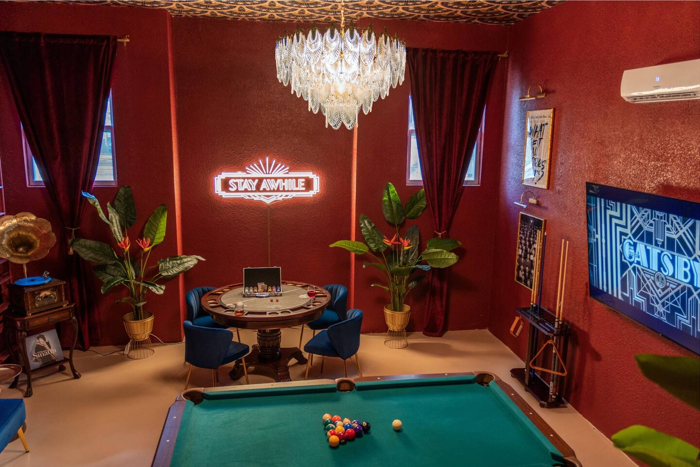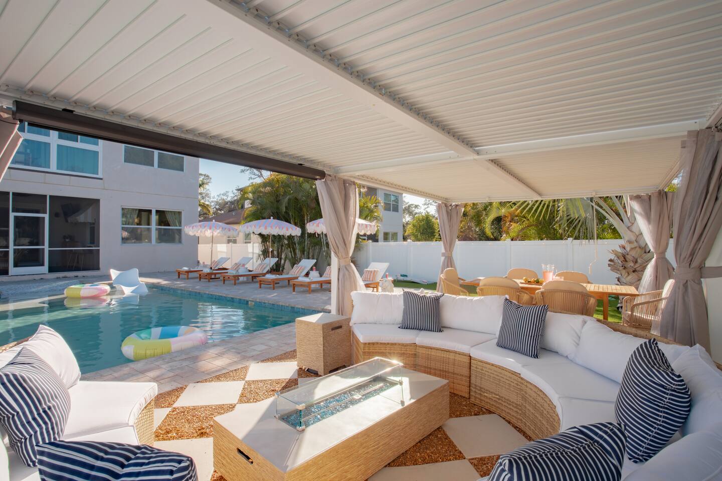 Welcome to The Palm Royale - A Gatsby Coastal Estate. Step into timeless elegance at this spacious two-story retreat. Just minutes from beaches, this home is 4 bedroom, 3.5 baths + a bonus bunkbed area! Spend sun-filled afternoons beside your heated pool, challenge friends to mini golf or pickleball then gather beneath the pergola for cocktails by the fire and outdoor cinema. Inside, the climate-controlled game lounge invites guests to unwind with poker, record spinning, and billiards!