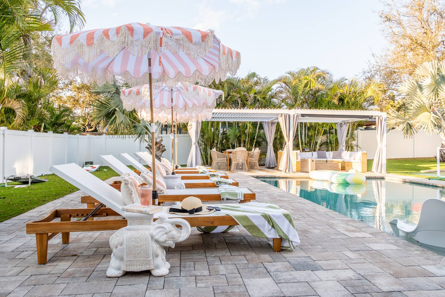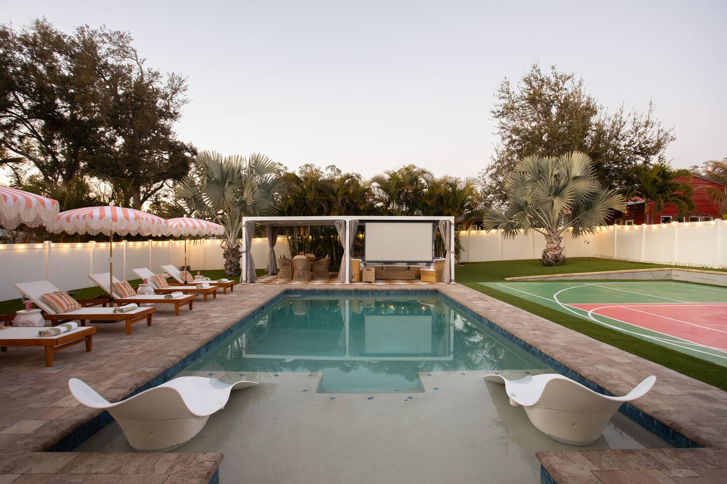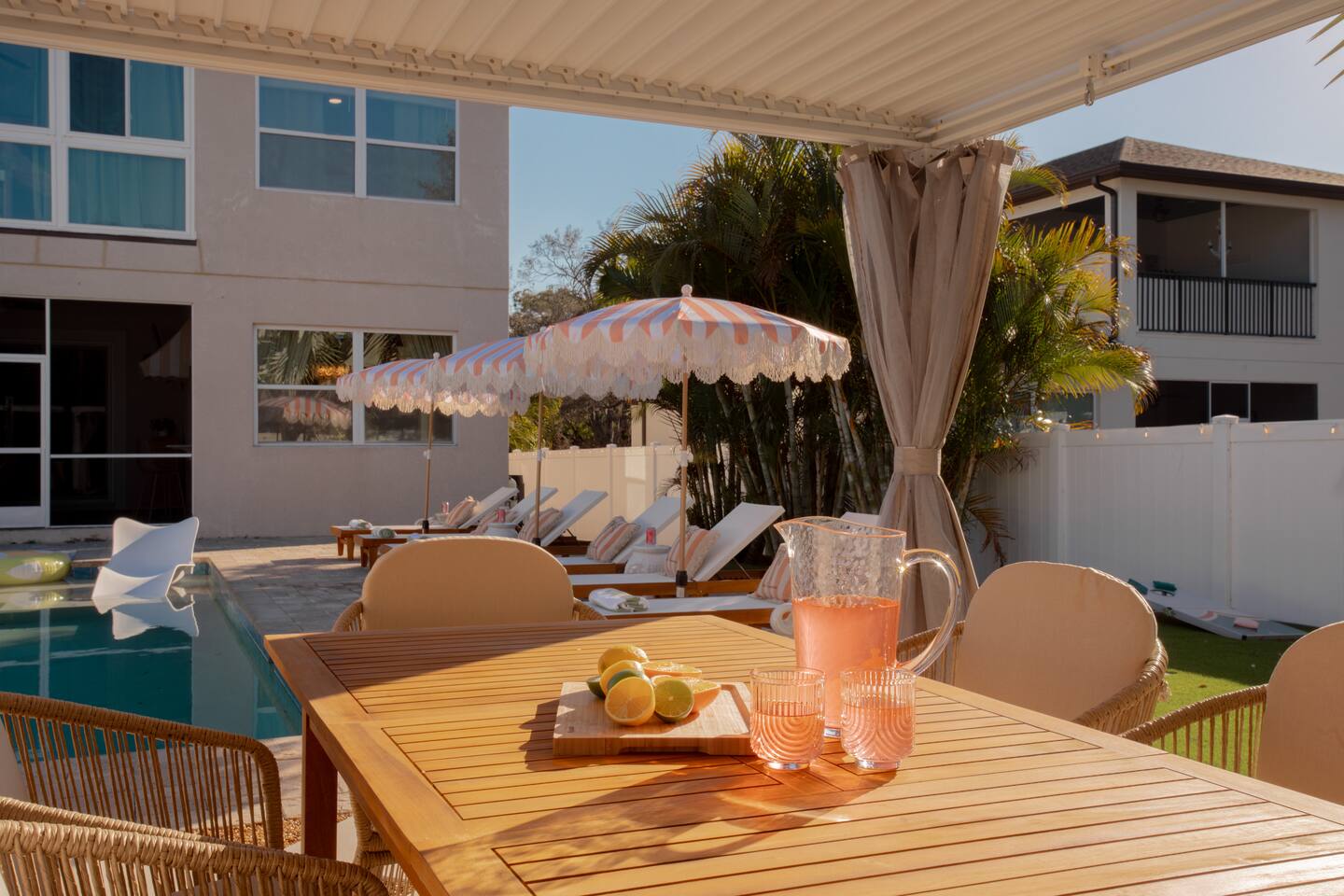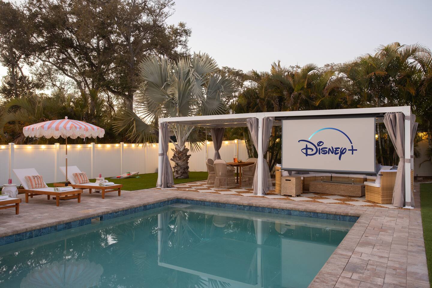 Welcome to The Palm Royale - A Gatsby Coastal Estate. Step into timeless elegance at this spacious two-story retreat. Just minutes from beaches, this home is 4 bedroom, 3.5 baths + a bonus bunkbed area! Spend sun-filled afternoons beside your heated pool, challenge friends to mini golf or pickleball then gather beneath the pergola for cocktails by the fire and outdoor cinema. Inside, the climate-controlled game lounge invites guests to unwind with poker, record spinning, and billiards!