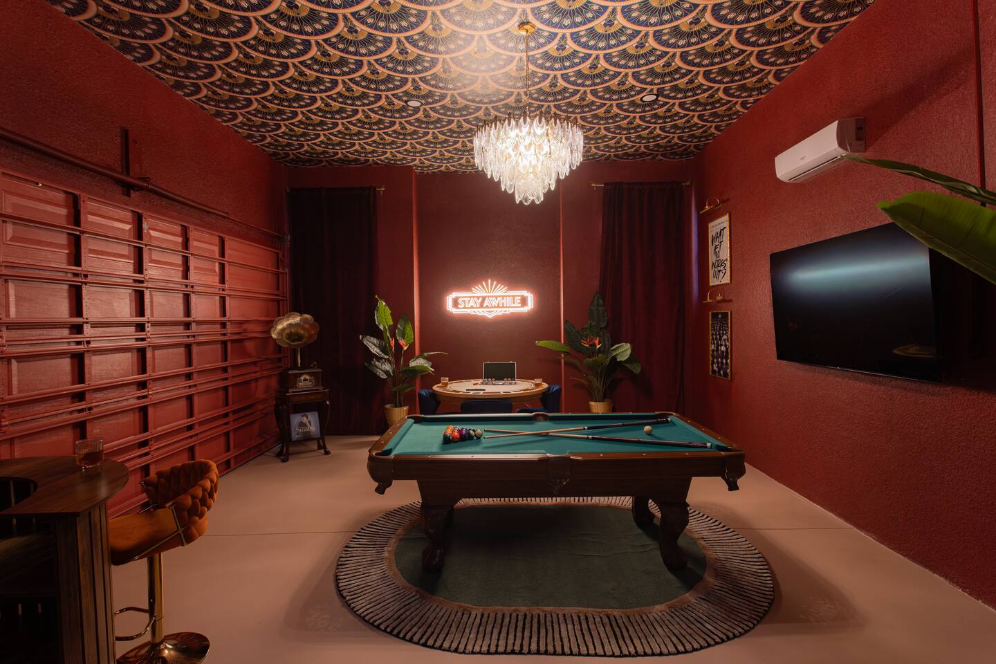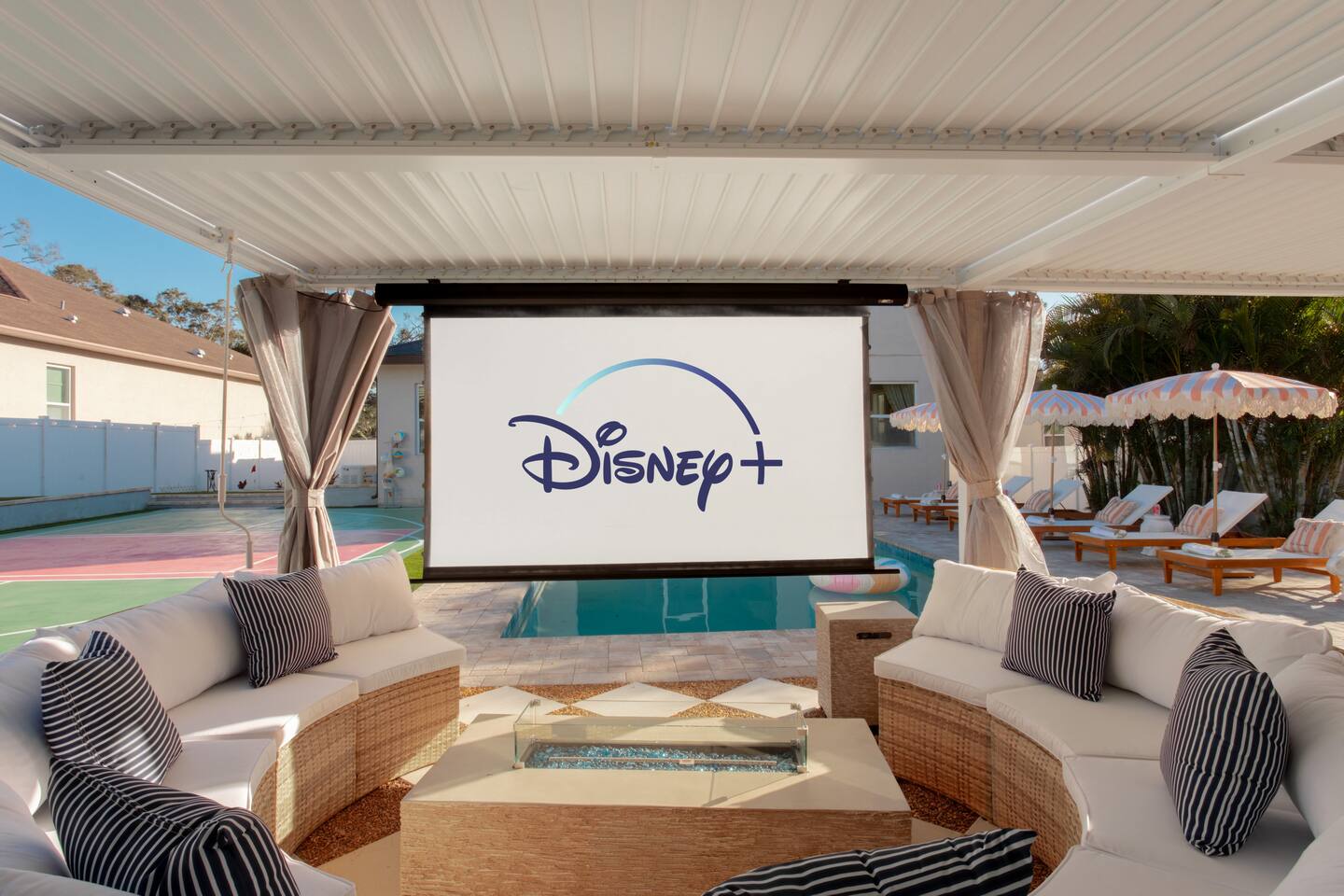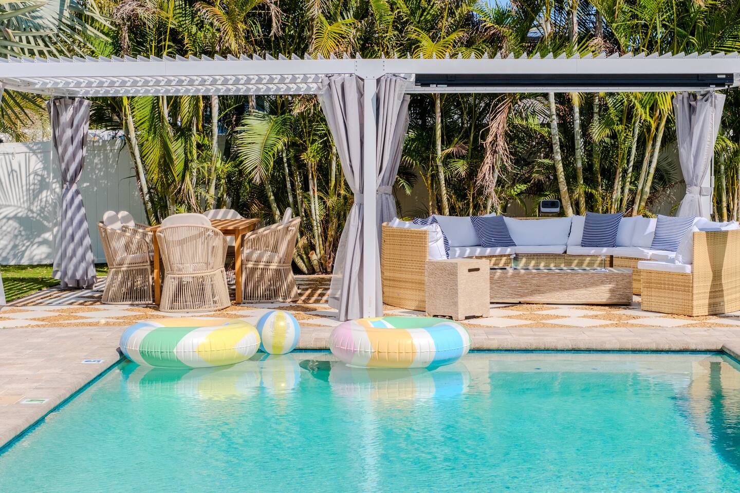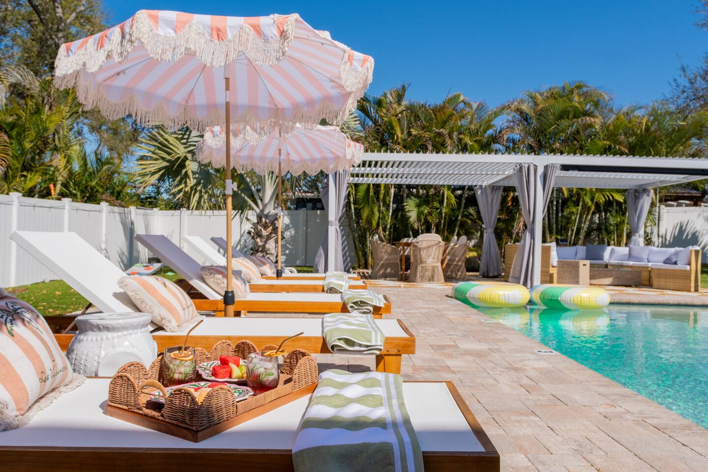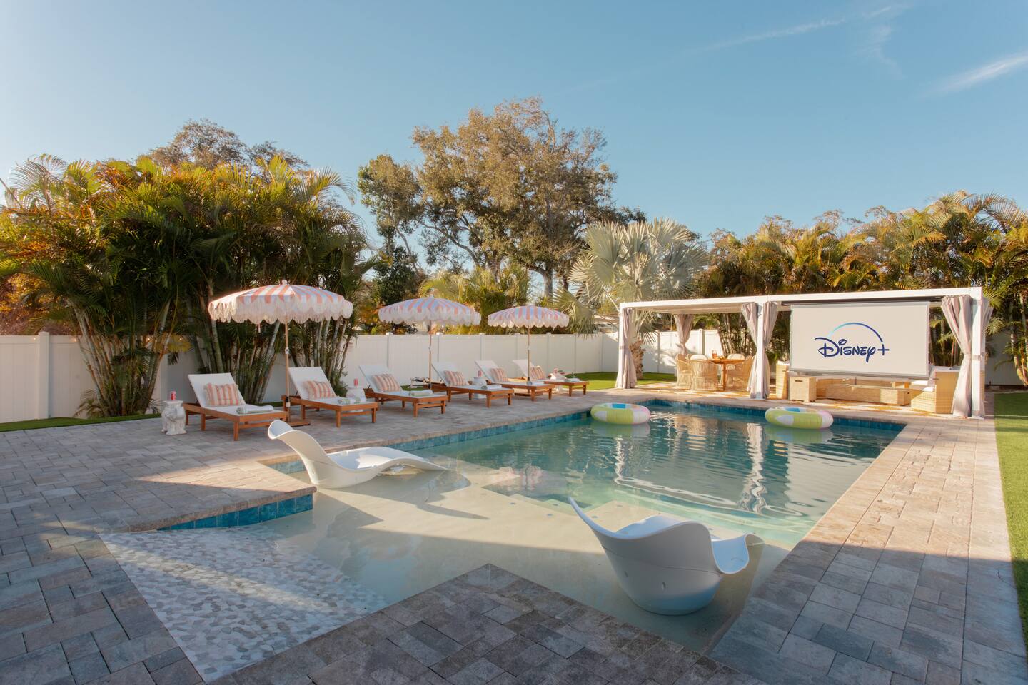 Welcome to The Palm Royale - A Gatsby Coastal Estate. Step into timeless elegance at this spacious two-story retreat. Just minutes from beaches, this home is 4 bedroom, 3.5 baths + a bonus bunkbed area! Spend sun-filled afternoons beside your heated pool, challenge friends to mini golf or pickleball then gather beneath the pergola for cocktails by the fire and outdoor cinema. Inside, the climate-controlled game lounge invites guests to unwind with poker, record spinning, and billiards!
