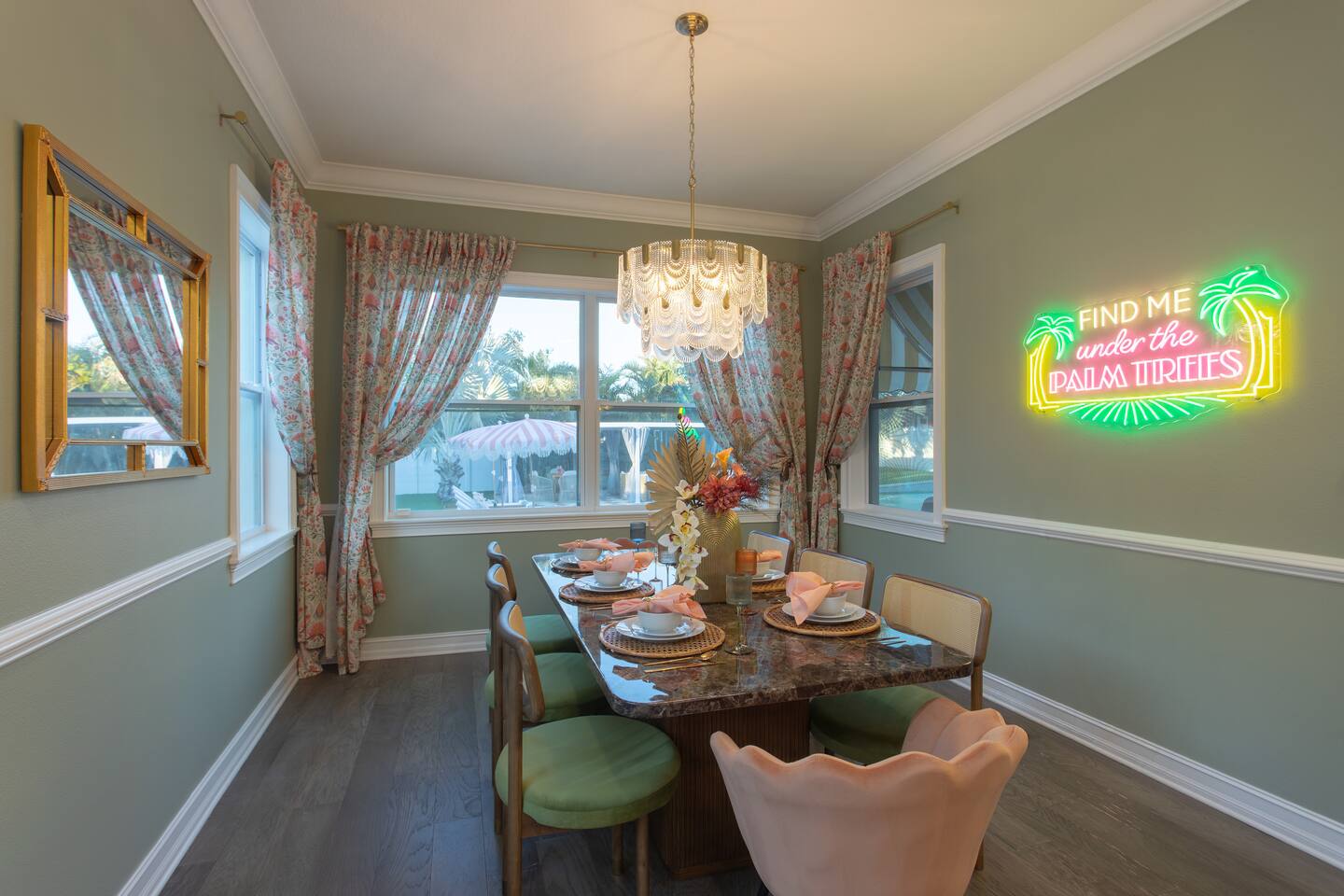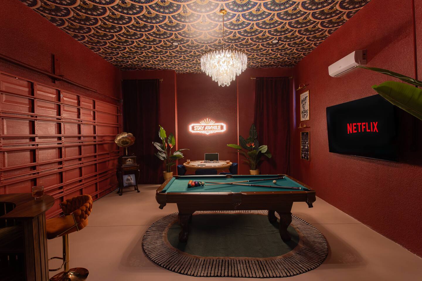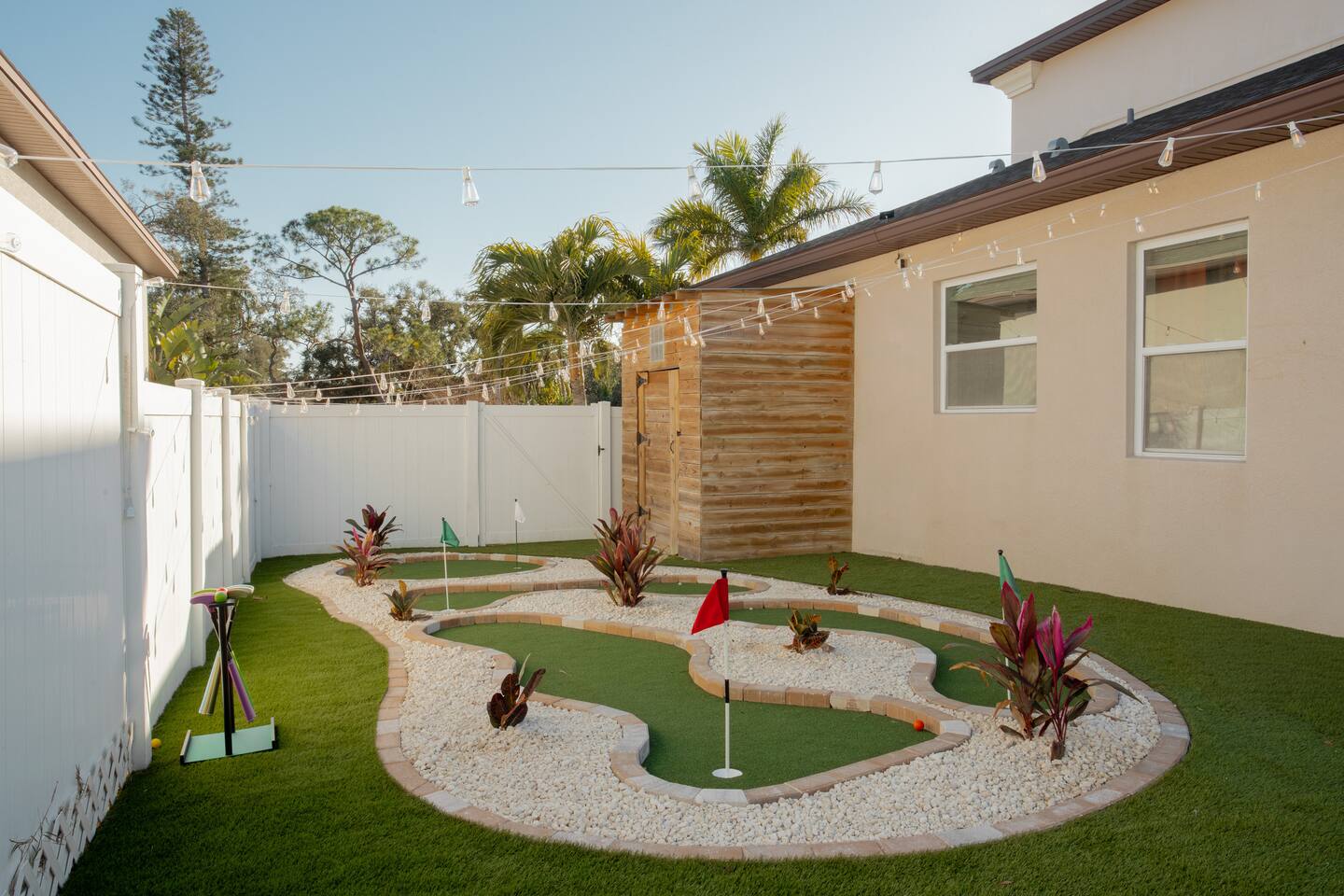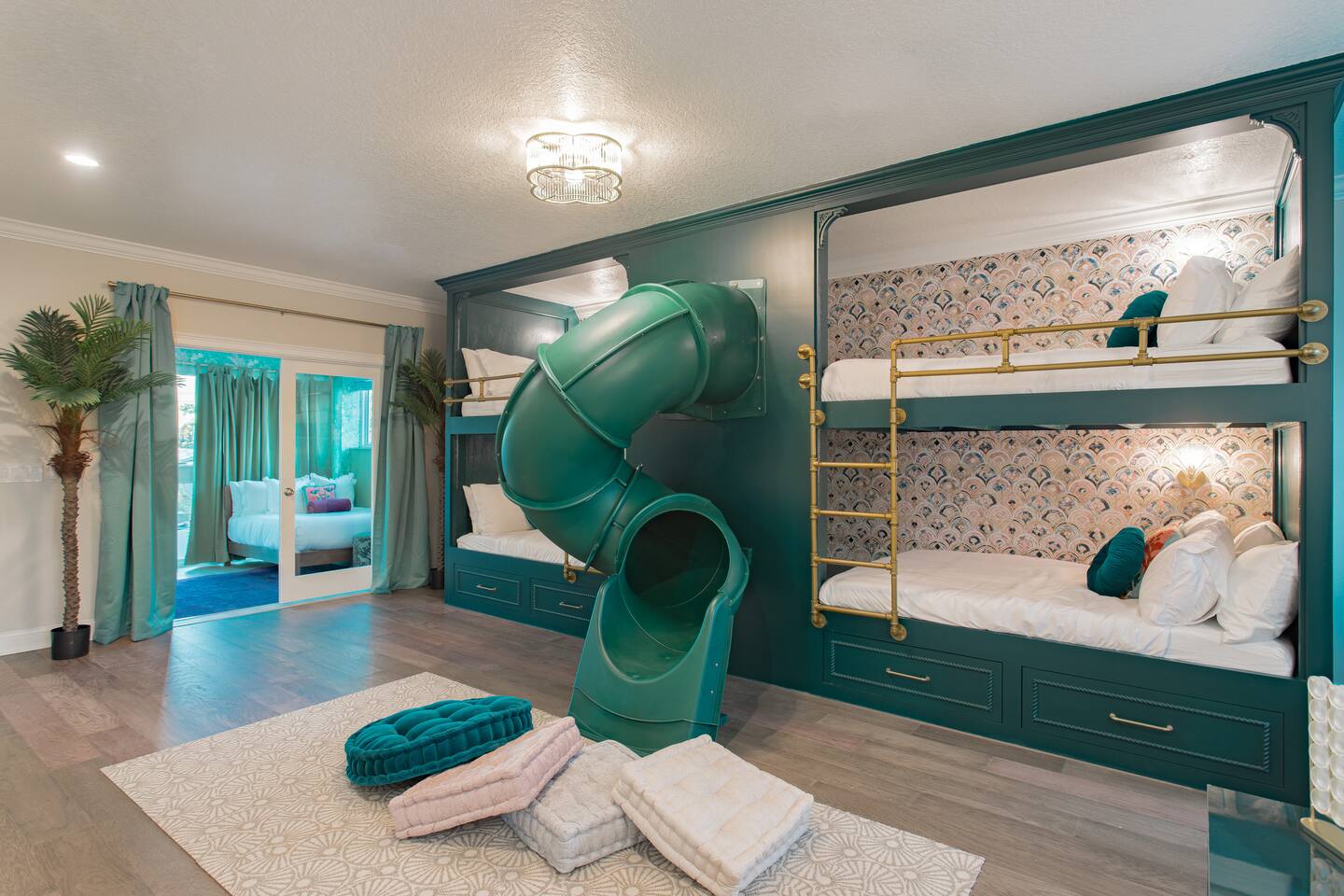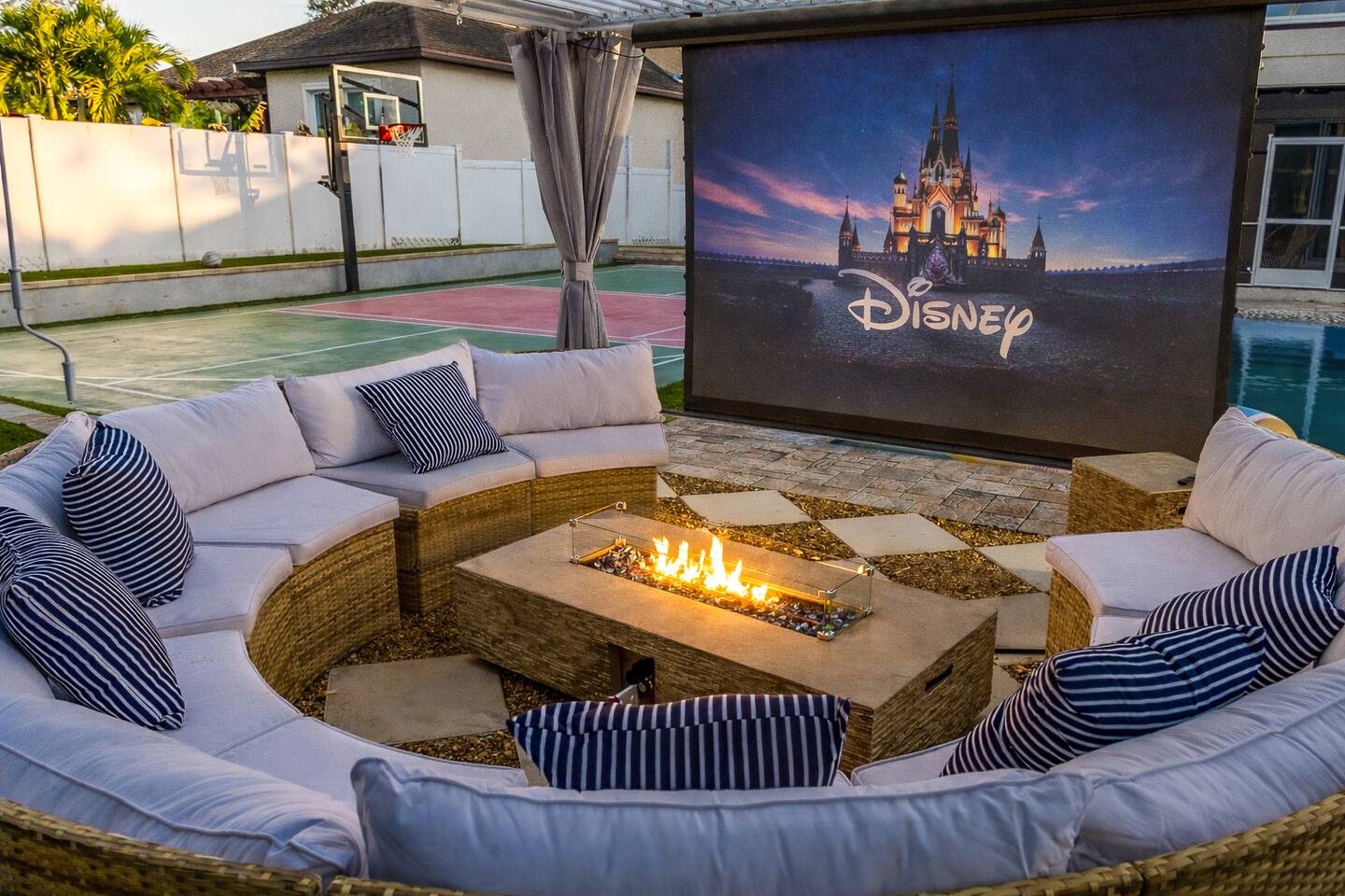 Welcome to The Palm Royale - A Gatsby Coastal Estate. Step into timeless elegance at this spacious two-story retreat. Just minutes from beaches, this home is 4 bedroom, 3.5 baths + a bonus bunkbed area! Spend sun-filled afternoons beside your heated pool, challenge friends to mini golf or pickleball then gather beneath the pergola for cocktails by the fire and outdoor cinema. Inside, the climate-controlled game lounge invites guests to unwind with poker, record spinning, and billiards!