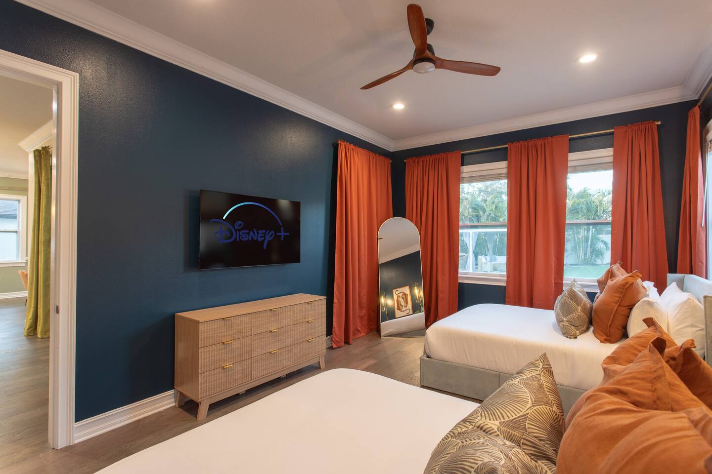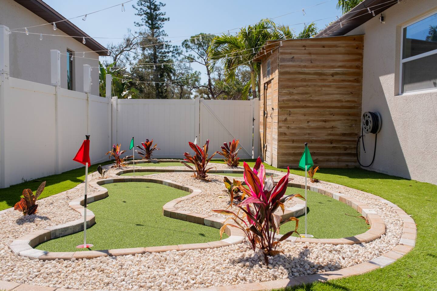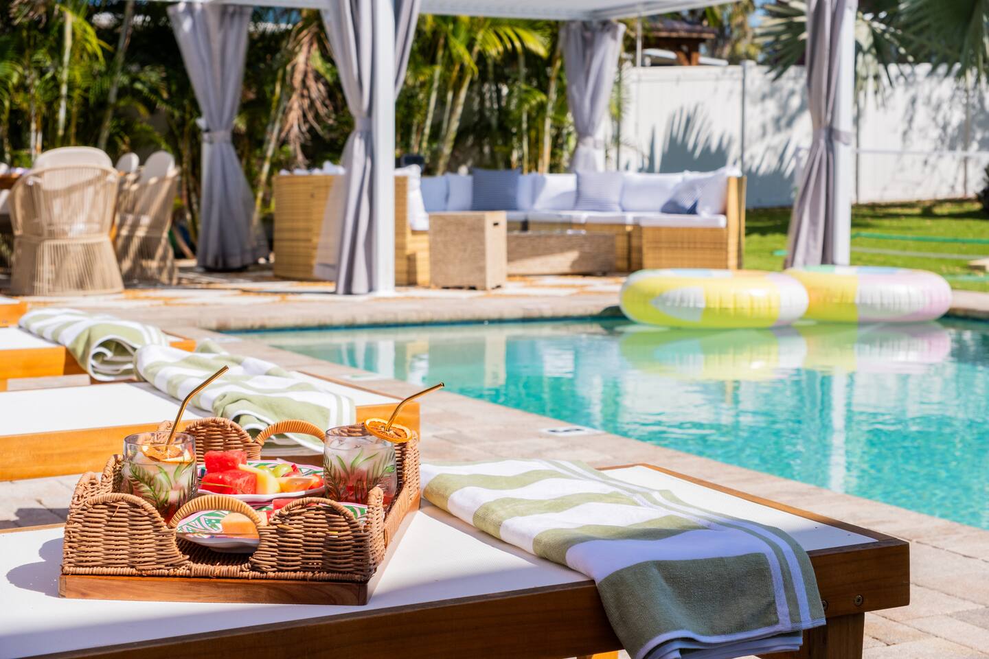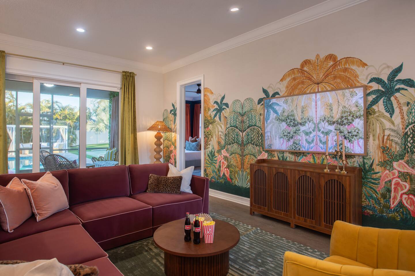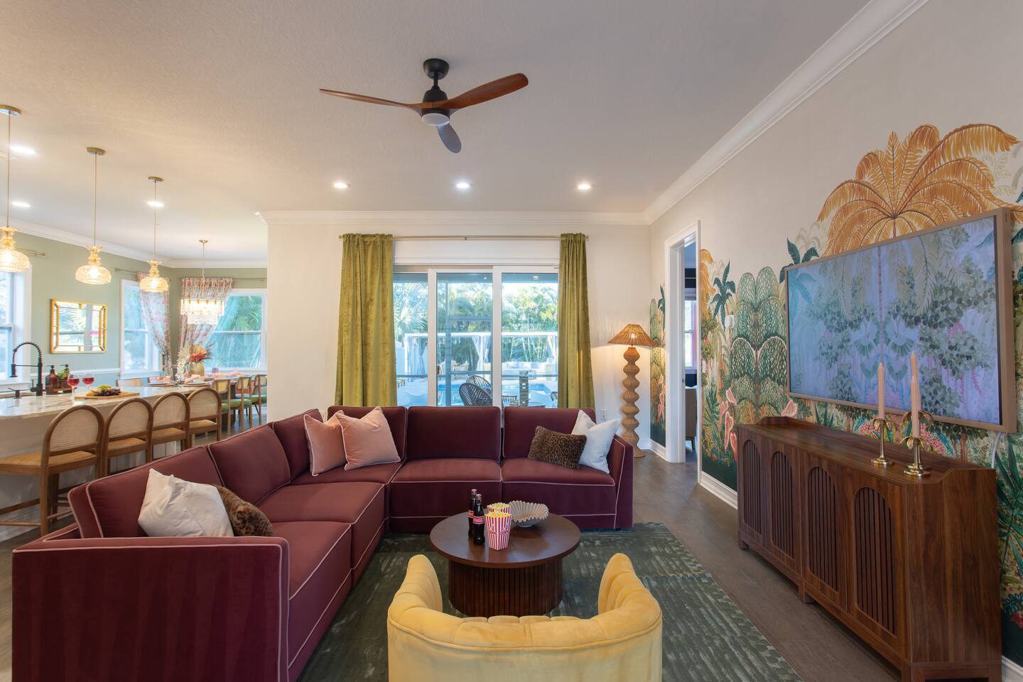 Welcome to The Palm Royale - A Gatsby Coastal Estate. Step into timeless elegance at this spacious two-story retreat. Just minutes from beaches, this home is 4 bedroom, 3.5 baths + a bonus bunkbed area! Spend sun-filled afternoons beside your heated pool, challenge friends to mini golf or pickleball then gather beneath the pergola for cocktails by the fire and outdoor cinema. Inside, the climate-controlled game lounge invites guests to unwind with poker, record spinning, and billiards!