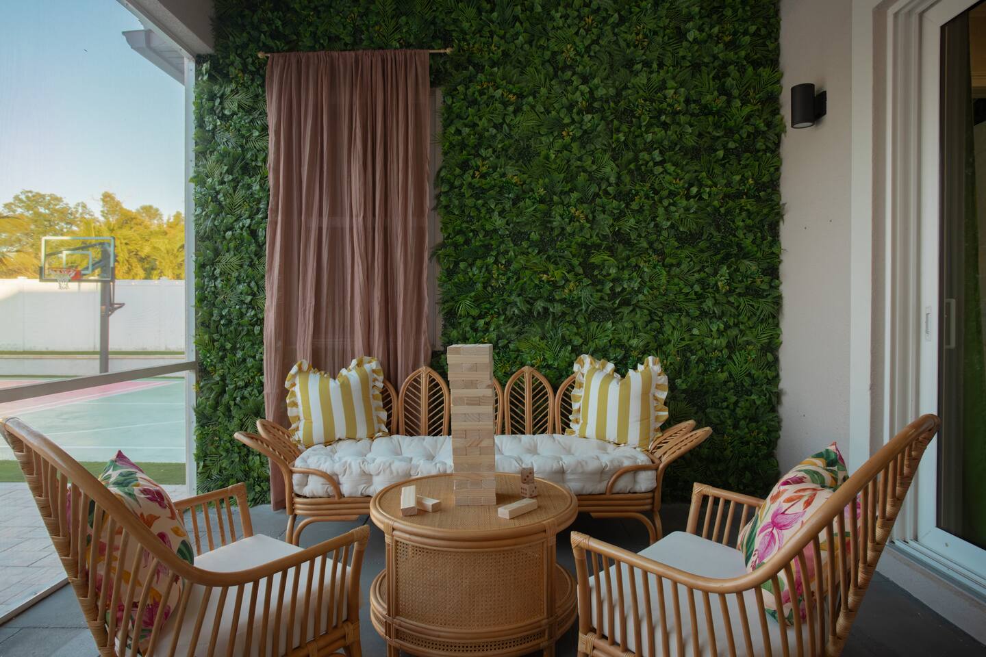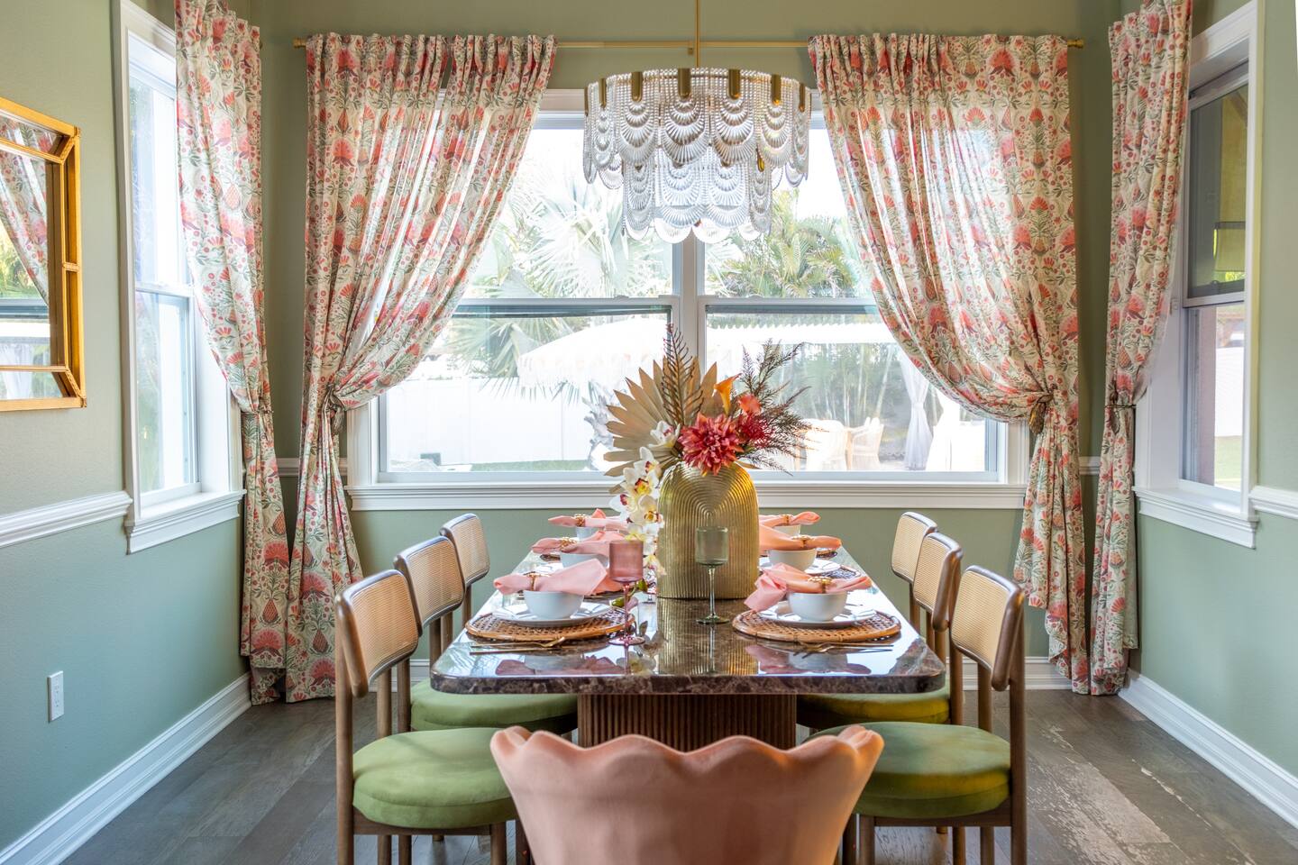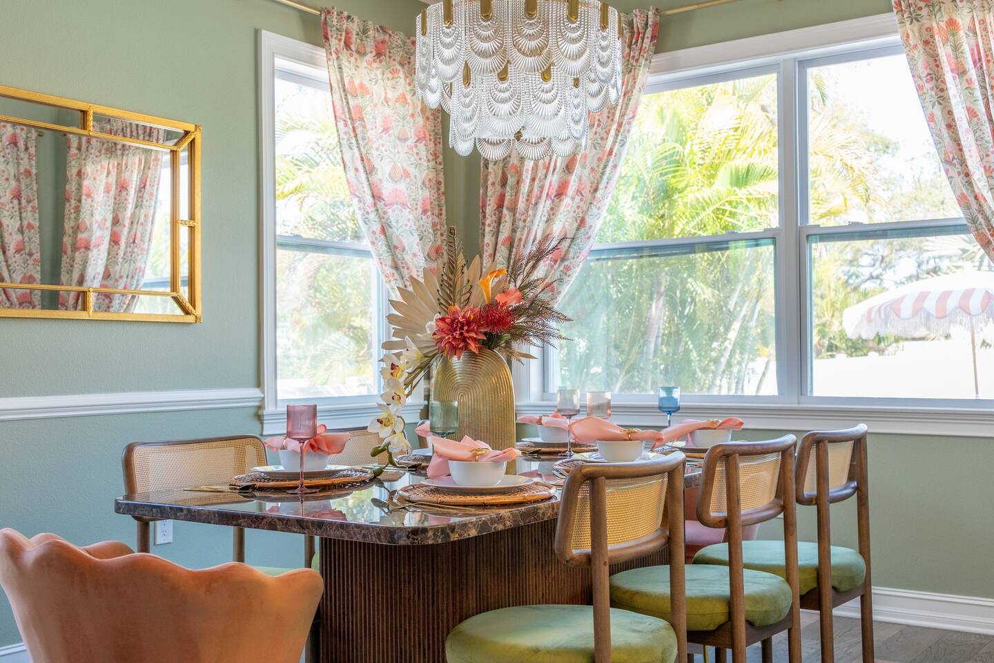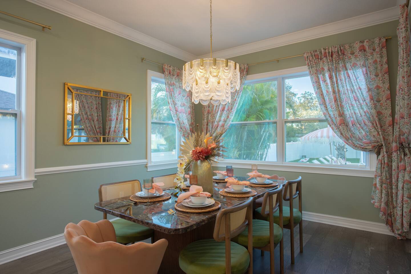 Welcome to The Palm Royale - A Gatsby Coastal Estate. Step into timeless elegance at this spacious two-story retreat. Just minutes from beaches, this home is 4 bedroom, 3.5 baths + a bonus bunkbed area! Spend sun-filled afternoons beside your heated pool, challenge friends to mini golf or pickleball then gather beneath the pergola for cocktails by the fire and outdoor cinema. Inside, the climate-controlled game lounge invites guests to unwind with poker, record spinning, and billiards!