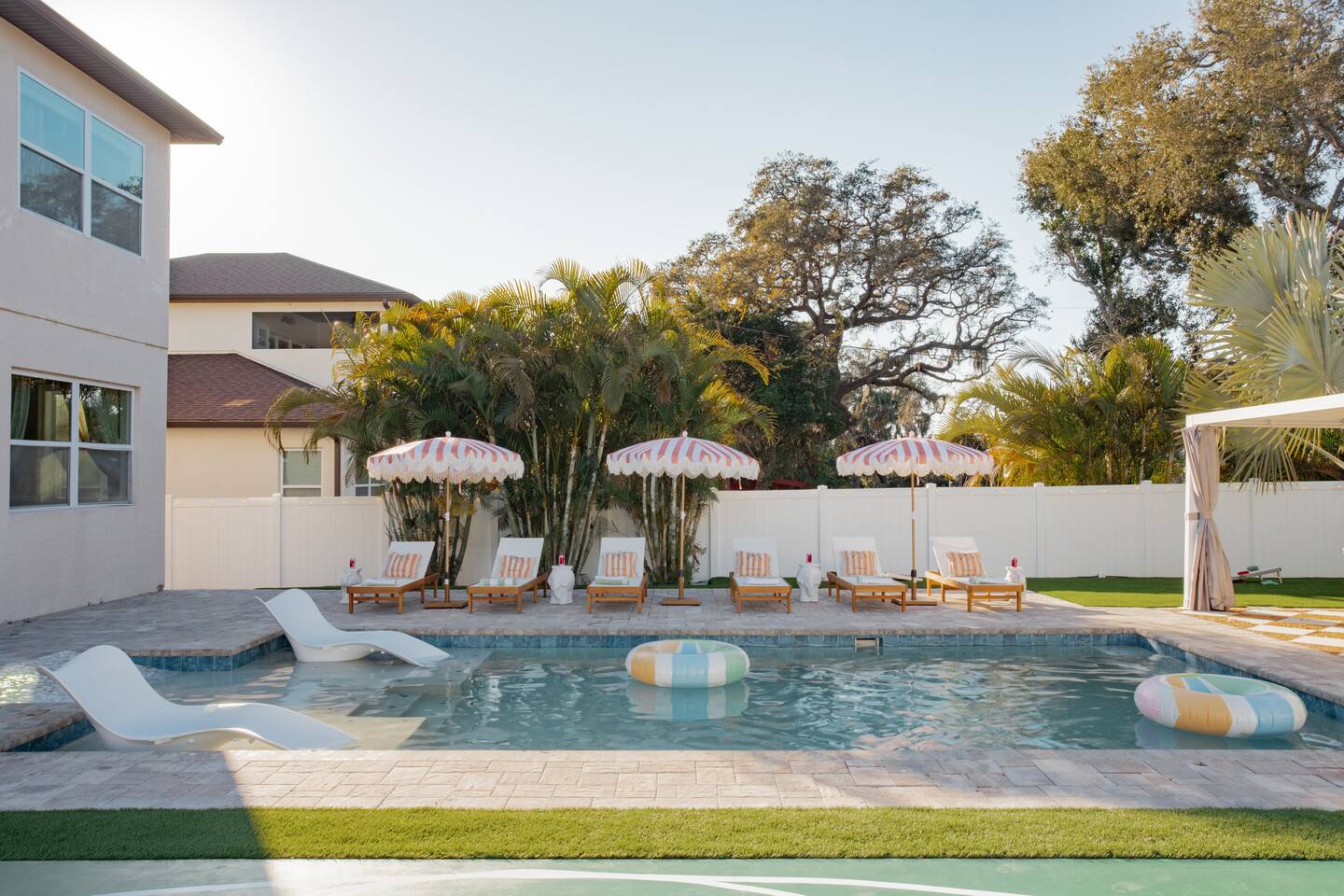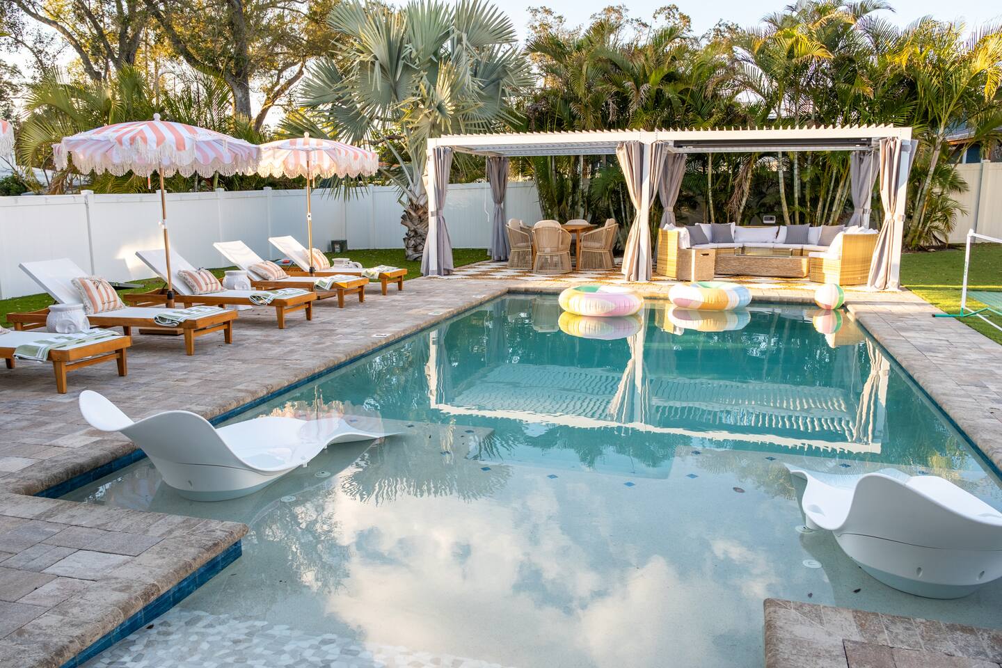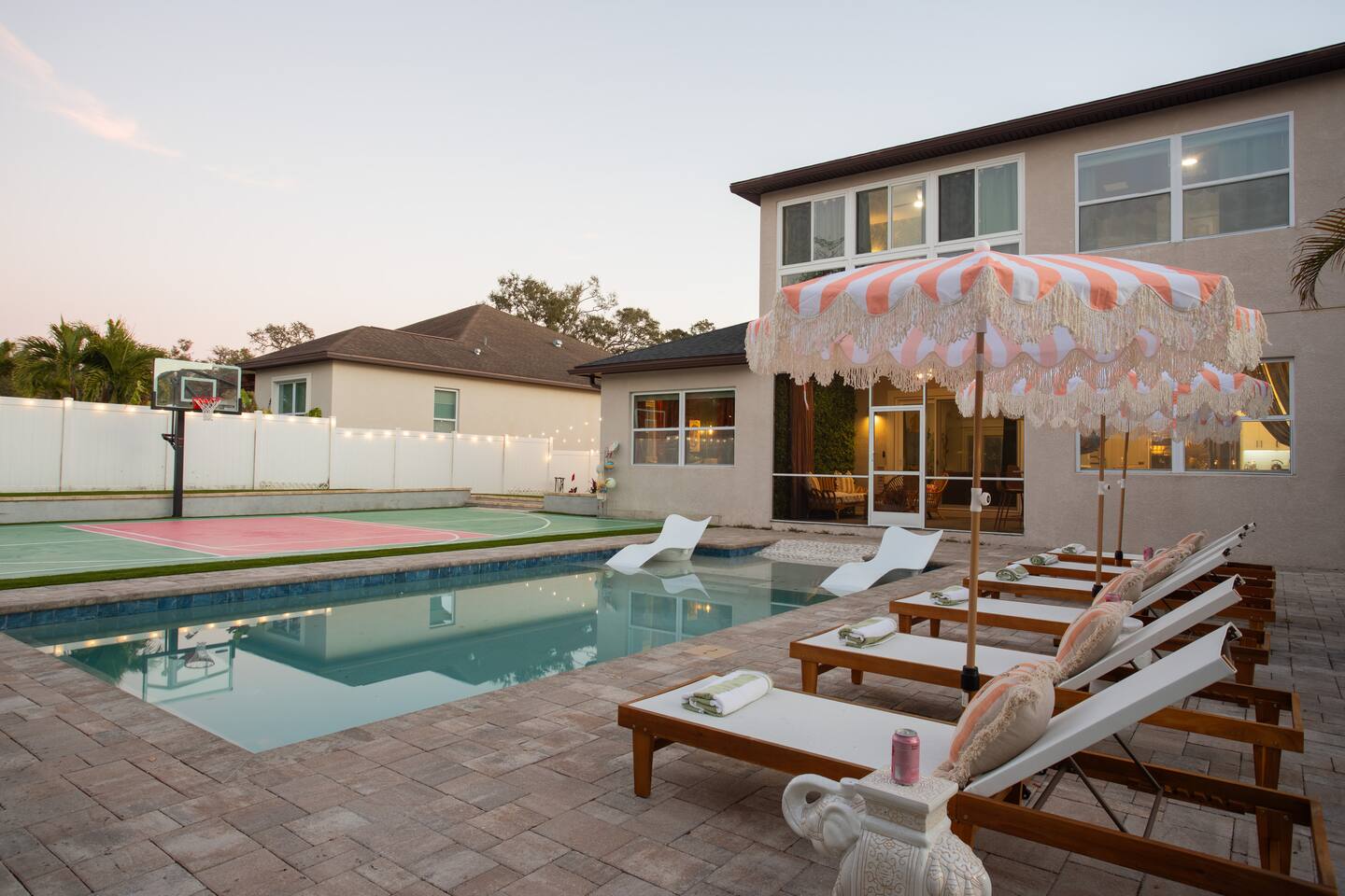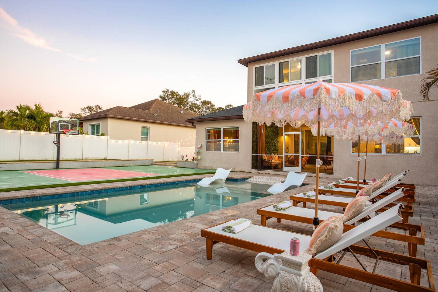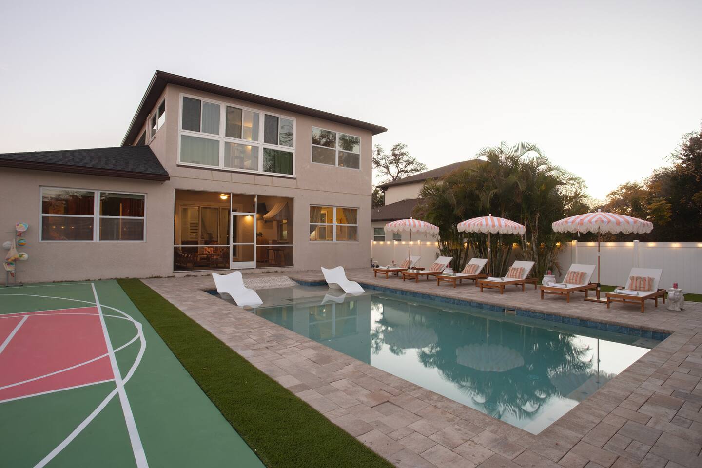 🛏️ Sleeping Arrangements- Sleeps up to 16-20 guests! Thoughtfully designed to give groups plenty of space to unwind. First Floor • Bedroom 1 — Two Queen beds with ensuite bathroom Second Floor • Bonus Bunk Area — Four Queen beds in bunk bed style • Bedroom 2 — King bed with ensuite bathroom • Bedroom 3 — Two Full beds • Bedroom 4 — Two Queen beds • Additional full guest bathroom Fresh linens, towels, and essentials are provided for every guest. 🐘The Estate Designed for comfort, style, and memorable group stays. • 2,700 sq ft two-story home • 4 bedrooms + spacious bunkbed bonus area • 3 full bathrooms (2 ensuite) • Elegant open-concept living spaces • Smart TVs (Roku + Google TV) • Climate-controlled garage lounge and game room • Samsung washer & dryer Rich finishes, warm lighting, and darker tones create a relaxed yet refined atmosphere perfect for gathering together. 🍽️ Chef-Ready Kitchen The fully equipped kitchen makes hosting effortless. • Keurig Duo (drip + single K-cup) • Toaster • Tea kettle • Blender • Air fryer • Full cookware set • Full glassware set • Refrigerator with filtered water & ice maker • Paper towels and essentials provided Perfect for group dinners, celebratory meals, or late-night snacks after a day by the pool. 🎮 Garage Lounge & Game Room A stylish entertainment space for relaxed evenings. • Billiards table • Poker table • Vintage-style record player with a collection of our favorite records • Climate-controlled comfort • Arcade machine located upstairs in the bunk suite room The perfect place for friendly games, music, and late-night conversations. 🌴 Private Backyard Oasis Step outside to your palm-lined outdoor retreat. • Heated pool (3–5 ft depth) • Sun shelf loungers in the pool • Outdoor pergola lounge • Outdoor dining seating for up to 6 • Projector screen for outdoor movies • 4-hole mini golf • Pickleball court • Basketball hoop • Cornhole • Giant Jenga • Propane fire table in the pergola • BBQ Grill and Utensils • Pool floats available 🏝️ Heated Pool – Additional Fee Required • Pool: $30/day and must be on at least 2 consecutive days • Pool Target Temp: 84-87°F 👶 Family Amenities • Pack-n-play • High chair • Kids utensils Baby amenities are located in the downstairs bedroom closet. 🏖️ Beach Day Essentials Located in the outdoor shed: • 6–8 beach chairs • Umbrella • Cooler • Beach wagon Beach towels are available in the patio cabinet and downstairs bedroom closet. 📍 Prime St. Petersburg Location Conveniently located in a quiet residential neighborhood of St. Petersburg, with easy access to some of the Gulf Coast’s best beaches, dining, and attractions. • 5 minutes to Madeira Beach • 15 minutes to St. Pete Beach • 6 minutes to Redington Beach • 9 minutes to John's Pass Village & Boardwalk • 30 minutes to St. Pete Pier and downtown St. Pete • 30 minutes to St. Pete–Clearwater International Airport • 45 minutes to Tampa International Airport 🚗 Parking • Driveway parking for 4–6 vehicles • Up to 2 additional vehicles with tandem parking • No street parking permitted 📌 House Rules Respecting the home ensures a wonderful stay for all guests. • Maximum occupancy: 20 guests • Quiet hours: 10 PM – 8 AM • No smoking or vaping • No open flames indoors • Thermostat must remain between 69°F and 78°F • No shoes inside the house • Use of pool and recreational equipment is at guest’s own risk • Please keep doors and windows closed to prevent pests • Report any damage promptly • Respect neighbors and the property at all times 🔒 Security For safety and property protection: • Exterior security cameras located at the front, side, and backyard of the home (no audio recording). The Palm Royale is perfect for elegant group getaways, celebrations, and memorable coastal retreats, where sun-drenched afternoons and glamorous evenings come together in true Florida style. 🌴✨