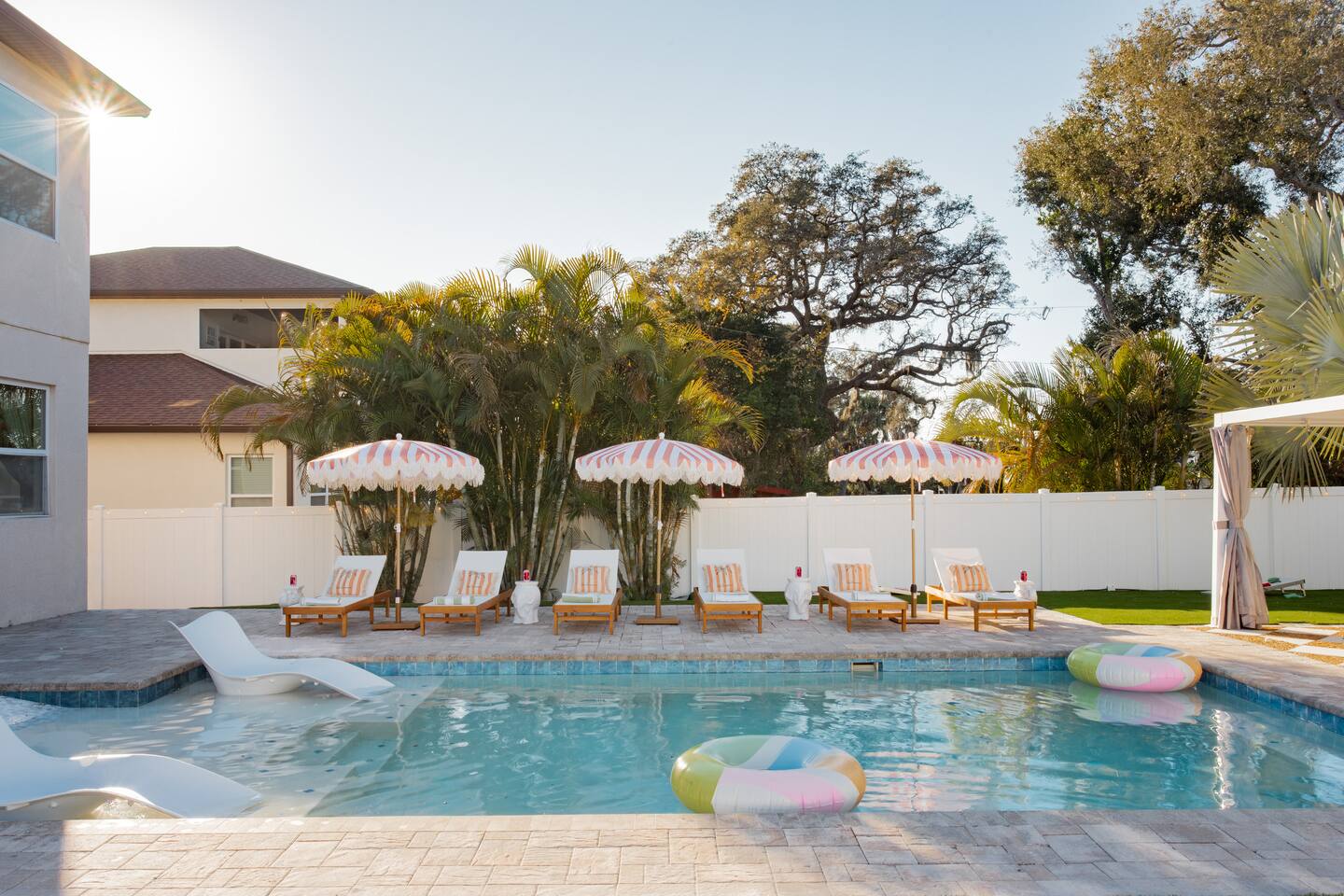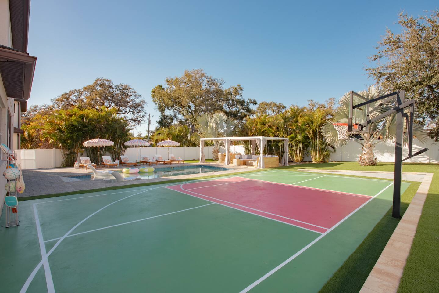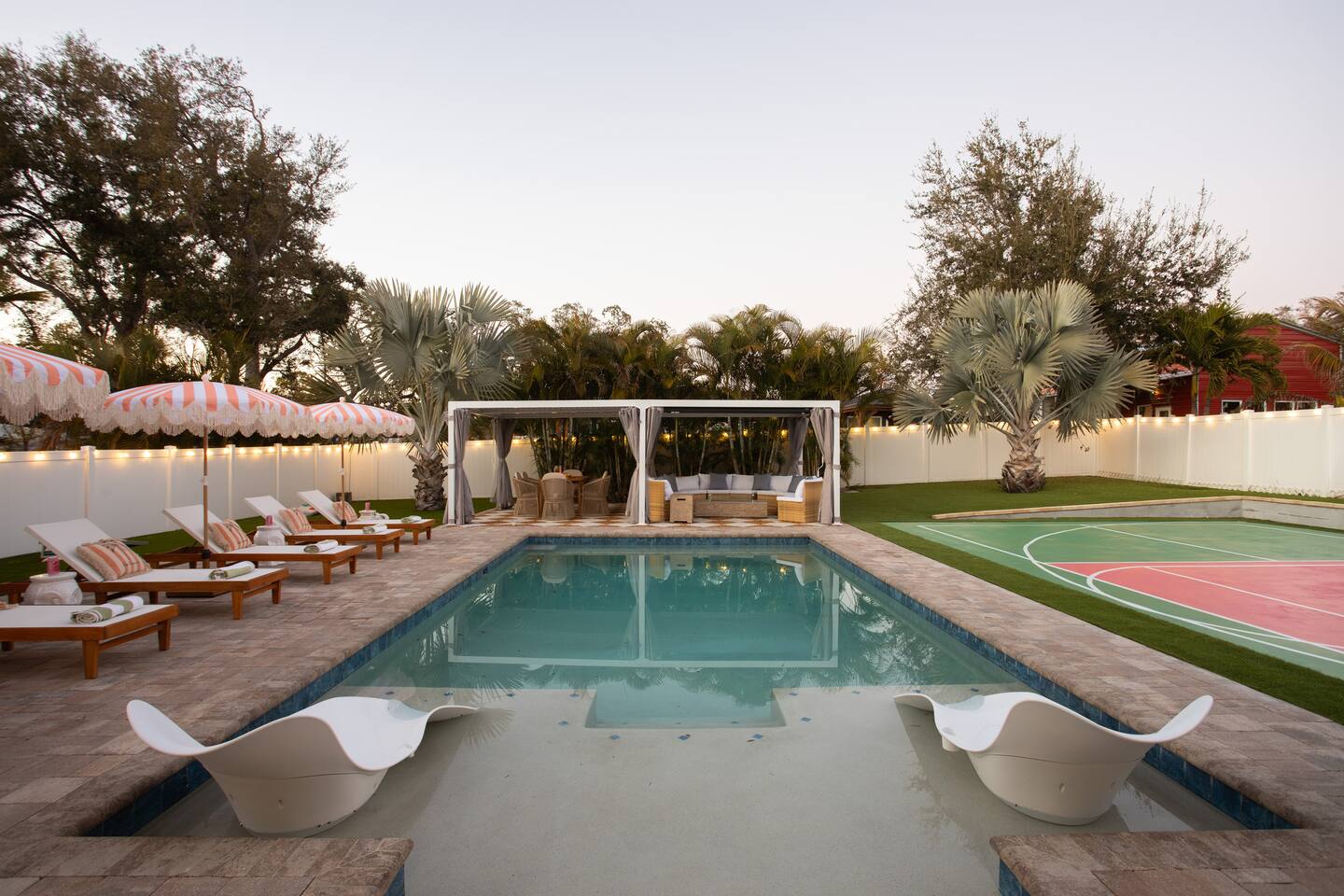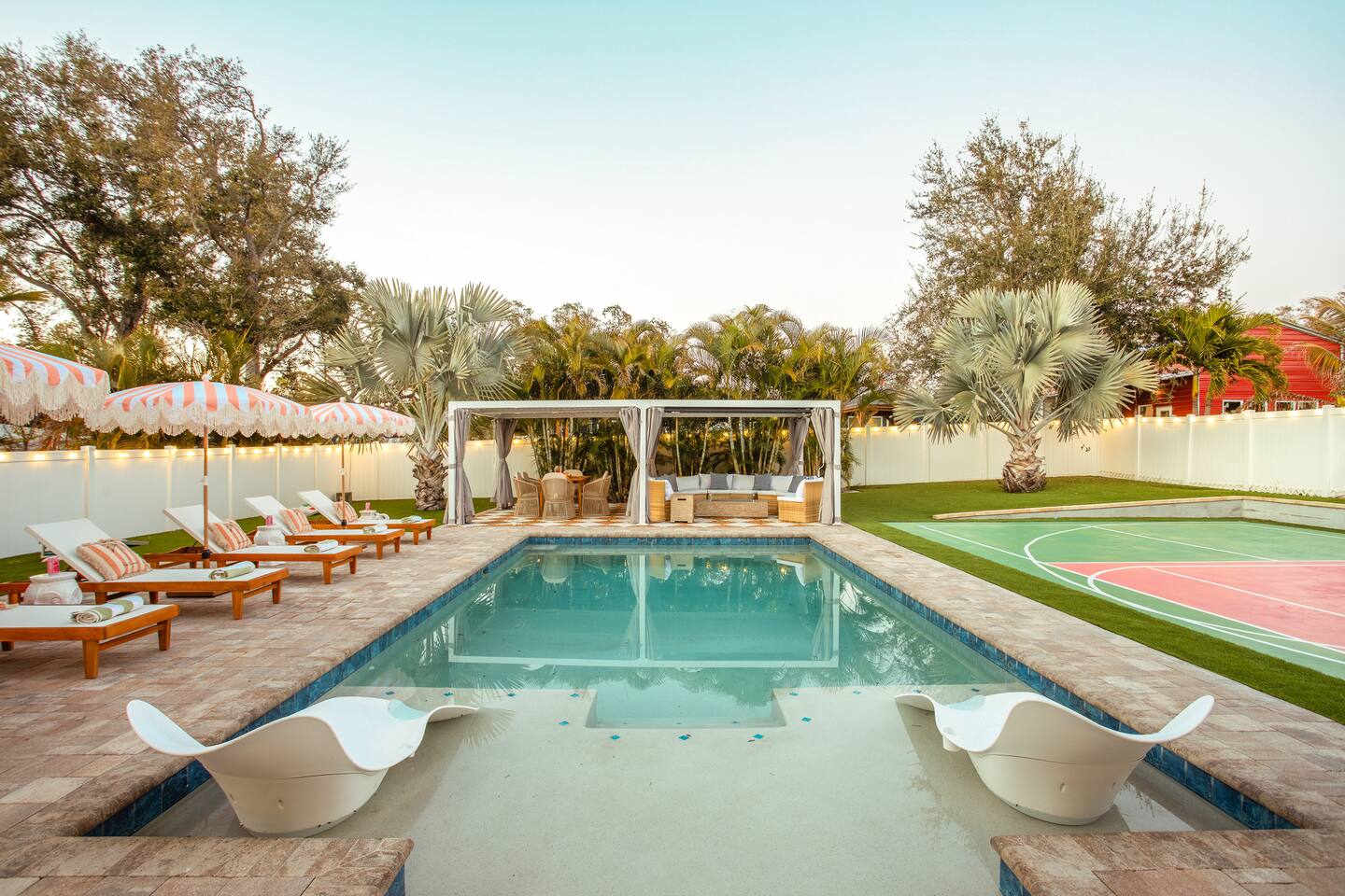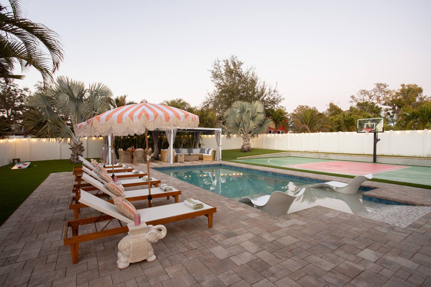 🛏️ Sleeping Arrangements- Sleeps up to 16-20 guests! Thoughtfully designed to give groups plenty of space to unwind. First Floor • Bedroom 1 — Two Queen beds with ensuite bathroom Second Floor • Bonus Bunk Area — Four Queen beds in bunk bed style • Bedroom 2 — King bed with ensuite bathroom • Bedroom 3 — Two Full beds • Bedroom 4 — Two Queen beds • Additional full guest bathroom Fresh linens, towels, and essentials are provided for every guest. 🐘The Estate Designed for comfort, style, and memorable group stays. • 2,700 sq ft two-story home • 4 bedrooms + spacious bunkbed bonus area • 3 full bathrooms (2 ensuite) • Elegant open-concept living spaces • Smart TVs (Roku + Google TV) • Climate-controlled garage lounge and game room • Samsung washer & dryer Rich finishes, warm lighting, and darker tones create a relaxed yet refined atmosphere perfect for gathering together. 🍽️ Chef-Ready Kitchen The fully equipped kitchen makes hosting effortless. • Keurig Duo (drip + single K-cup) • Toaster • Tea kettle • Blender • Air fryer • Full cookware set • Full glassware set • Refrigerator with filtered water & ice maker • Paper towels and essentials provided Perfect for group dinners, celebratory meals, or late-night snacks after a day by the pool. 🎮 Garage Lounge & Game Room A stylish entertainment space for relaxed evenings. • Billiards table • Poker table • Vintage-style record player with a collection of our favorite records • Climate-controlled comfort • Arcade machine located upstairs in the bunk suite room The perfect place for friendly games, music, and late-night conversations. 🌴 Private Backyard Oasis Step outside to your palm-lined outdoor retreat. • Heated pool (3–5 ft depth) • Sun shelf loungers in the pool • Outdoor pergola lounge • Outdoor dining seating for up to 6 • Projector screen for outdoor movies • 4-hole mini golf • Pickleball court • Basketball hoop • Cornhole • Giant Jenga • Propane fire table in the pergola • BBQ Grill and Utensils • Pool floats available 🏝️ Heated Pool – Additional Fee Required • Pool: $30/day and must be on at least 2 consecutive days • Pool Target Temp: 84-87°F 👶 Family Amenities • Pack-n-play • High chair • Kids utensils Baby amenities are located in the downstairs bedroom closet. 🏖️ Beach Day Essentials Located in the outdoor shed: • 6–8 beach chairs • Umbrella • Cooler • Beach wagon Beach towels are available in the patio cabinet and downstairs bedroom closet. 📍 Prime St. Petersburg Location Conveniently located in a quiet residential neighborhood of St. Petersburg, with easy access to some of the Gulf Coast’s best beaches, dining, and attractions. • 5 minutes to Madeira Beach • 15 minutes to St. Pete Beach • 6 minutes to Redington Beach • 9 minutes to John's Pass Village & Boardwalk • 30 minutes to St. Pete Pier and downtown St. Pete • 30 minutes to St. Pete–Clearwater International Airport • 45 minutes to Tampa International Airport 🚗 Parking • Driveway parking for 4–6 vehicles • Up to 2 additional vehicles with tandem parking • No street parking permitted 📌 House Rules Respecting the home ensures a wonderful stay for all guests. • Maximum occupancy: 20 guests • Quiet hours: 10 PM – 8 AM • No smoking or vaping • No open flames indoors • Thermostat must remain between 69°F and 78°F • No shoes inside the house • Use of pool and recreational equipment is at guest’s own risk • Please keep doors and windows closed to prevent pests • Report any damage promptly • Respect neighbors and the property at all times 🔒 Security For safety and property protection: • Exterior security cameras located at the front, side, and backyard of the home (no audio recording). The Palm Royale is perfect for elegant group getaways, celebrations, and memorable coastal retreats, where sun-drenched afternoons and glamorous evenings come together in true Florida style. 🌴✨