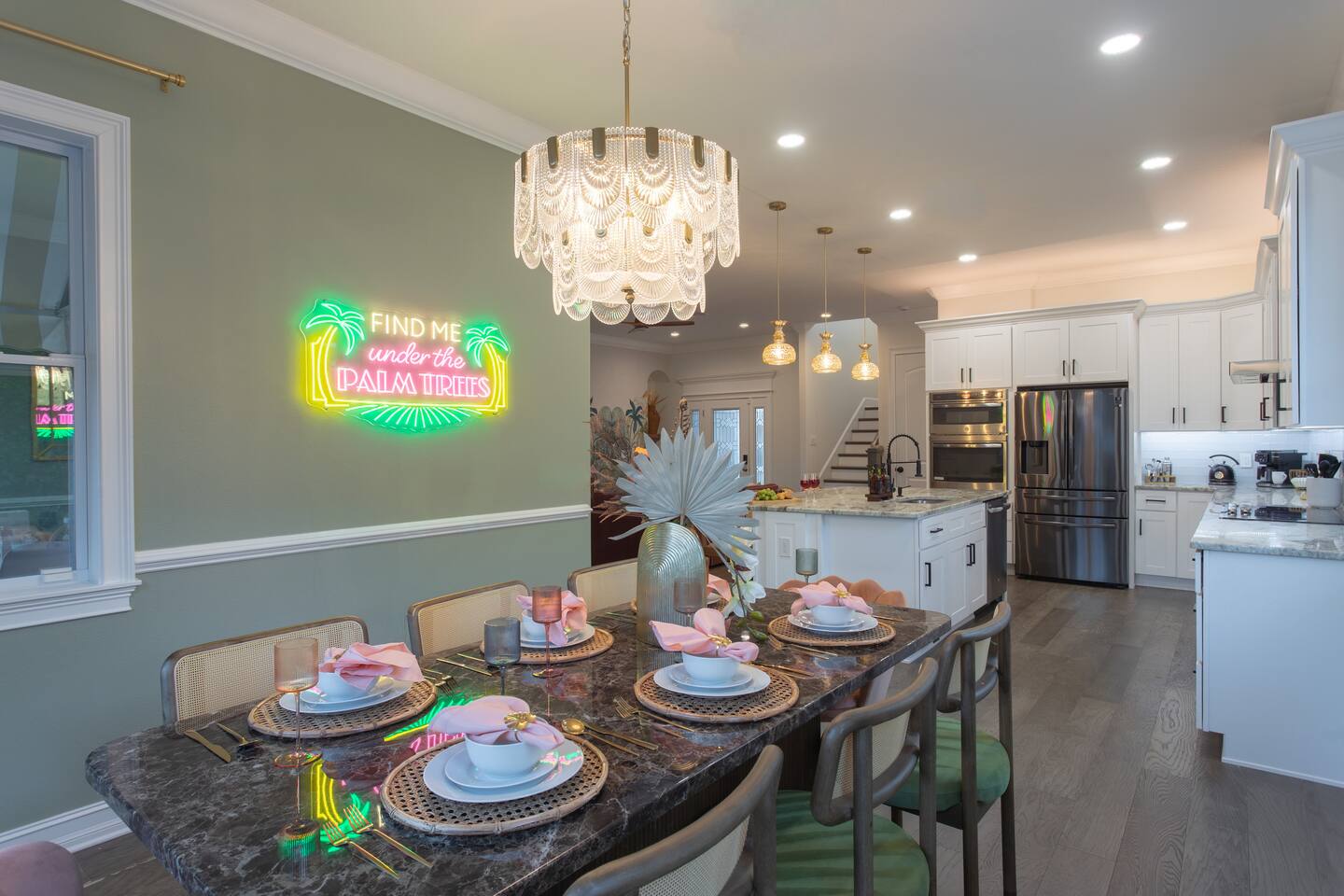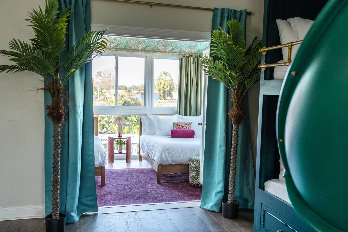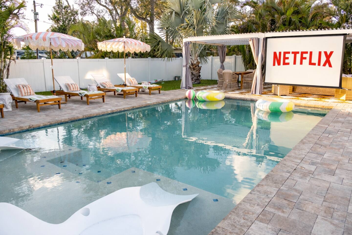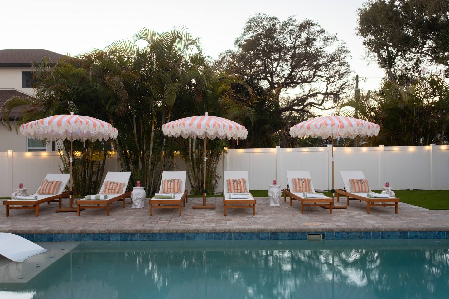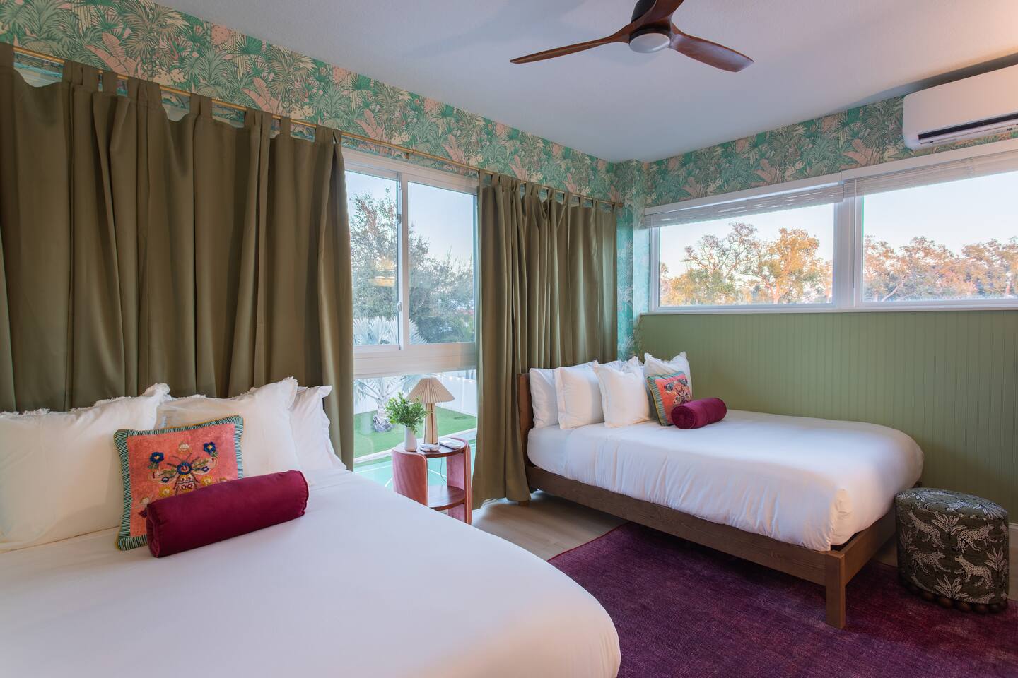 🛏️ Sleeping Arrangements- Sleeps up to 16-20 guests! Thoughtfully designed to give groups plenty of space to unwind. First Floor • Bedroom 1 — Two Queen beds with ensuite bathroom Second Floor • Bonus Bunk Area — Four Queen beds in bunk bed style • Bedroom 2 — King bed with ensuite bathroom • Bedroom 3 — Two Full beds • Bedroom 4 — Two Queen beds • Additional full guest bathroom Fresh linens, towels, and essentials are provided for every guest. 🐘The Estate Designed for comfort, style, and memorable group stays. • 2,700 sq ft two-story home • 4 bedrooms + spacious bunkbed bonus area • 3 full bathrooms (2 ensuite) • Elegant open-concept living spaces • Smart TVs (Roku + Google TV) • Climate-controlled garage lounge and game room • Samsung washer & dryer Rich finishes, warm lighting, and darker tones create a relaxed yet refined atmosphere perfect for gathering together. 🍽️ Chef-Ready Kitchen The fully equipped kitchen makes hosting effortless. • Keurig Duo (drip + single K-cup) • Toaster • Tea kettle • Blender • Air fryer • Full cookware set • Full glassware set • Refrigerator with filtered water & ice maker • Paper towels and essentials provided Perfect for group dinners, celebratory meals, or late-night snacks after a day by the pool. 🎮 Garage Lounge & Game Room A stylish entertainment space for relaxed evenings. • Billiards table • Poker table • Vintage-style record player with a collection of our favorite records • Climate-controlled comfort • Arcade machine located upstairs in the bunk suite room The perfect place for friendly games, music, and late-night conversations. 🌴 Private Backyard Oasis Step outside to your palm-lined outdoor retreat. • Heated pool (3–5 ft depth) • Sun shelf loungers in the pool • Outdoor pergola lounge • Outdoor dining seating for up to 6 • Projector screen for outdoor movies • 4-hole mini golf • Pickleball court • Basketball hoop • Cornhole • Giant Jenga • Propane fire table in the pergola • BBQ Grill and Utensils • Pool floats available 🏝️ Heated Pool – Additional Fee Required • Pool: $30/day and must be on at least 2 consecutive days • Pool Target Temp: 84-87°F 👶 Family Amenities • Pack-n-play • High chair • Kids utensils Baby amenities are located in the downstairs bedroom closet. 🏖️ Beach Day Essentials Located in the outdoor shed: • 6–8 beach chairs • Umbrella • Cooler • Beach wagon Beach towels are available in the patio cabinet and downstairs bedroom closet. 📍 Prime St. Petersburg Location Conveniently located in a quiet residential neighborhood of St. Petersburg, with easy access to some of the Gulf Coast’s best beaches, dining, and attractions. • 5 minutes to Madeira Beach • 15 minutes to St. Pete Beach • 6 minutes to Redington Beach • 9 minutes to John's Pass Village & Boardwalk • 30 minutes to St. Pete Pier and downtown St. Pete • 30 minutes to St. Pete–Clearwater International Airport • 45 minutes to Tampa International Airport 🚗 Parking • Driveway parking for 4–6 vehicles • Up to 2 additional vehicles with tandem parking • No street parking permitted 📌 House Rules Respecting the home ensures a wonderful stay for all guests. • Maximum occupancy: 20 guests • Quiet hours: 10 PM – 8 AM • No smoking or vaping • No open flames indoors • Thermostat must remain between 69°F and 78°F • No shoes inside the house • Use of pool and recreational equipment is at guest’s own risk • Please keep doors and windows closed to prevent pests • Report any damage promptly • Respect neighbors and the property at all times 🔒 Security For safety and property protection: • Exterior security cameras located at the front, side, and backyard of the home (no audio recording). The Palm Royale is perfect for elegant group getaways, celebrations, and memorable coastal retreats, where sun-drenched afternoons and glamorous evenings come together in true Florida style. 🌴✨