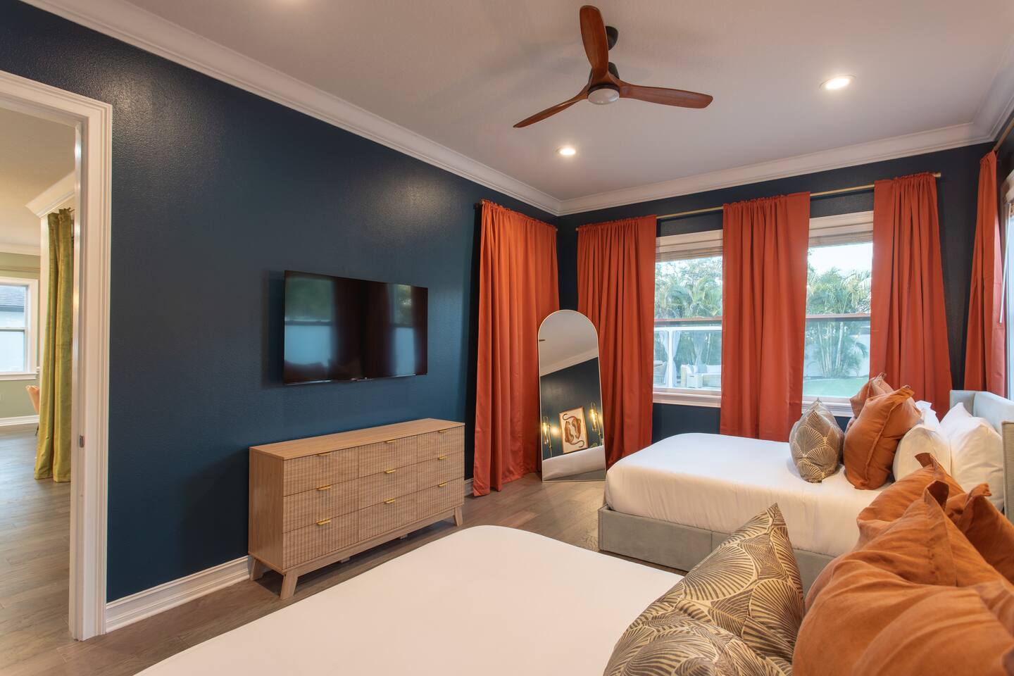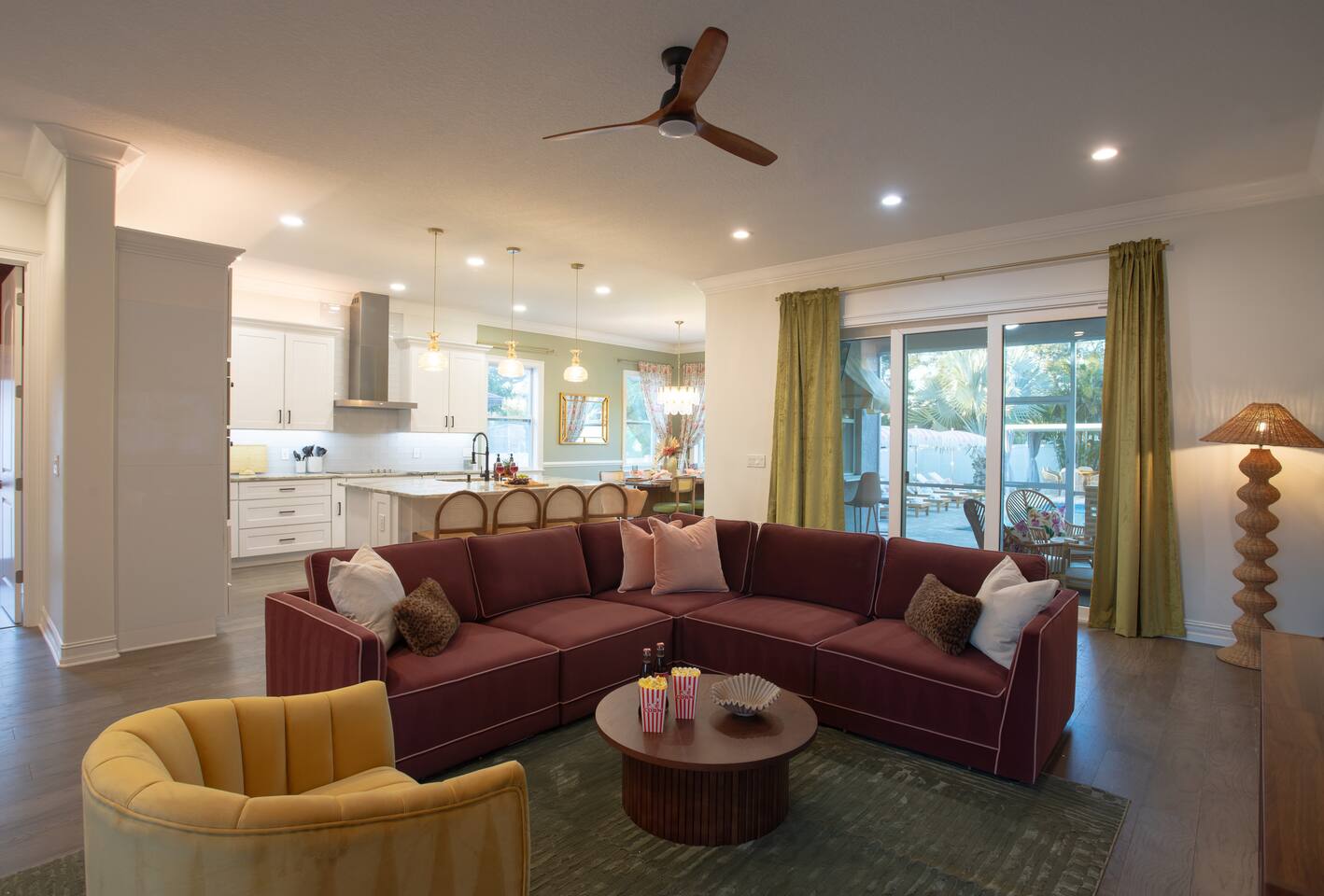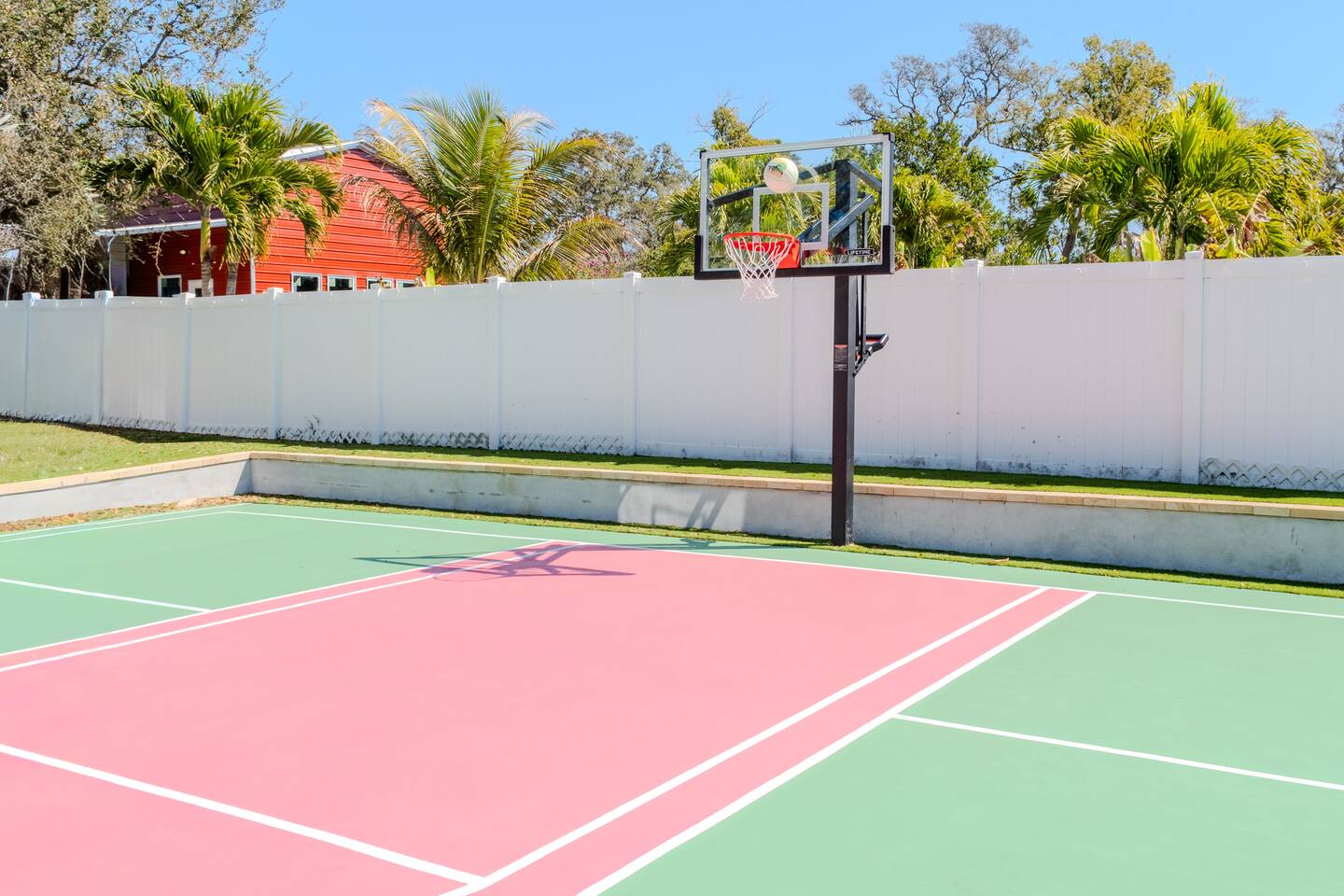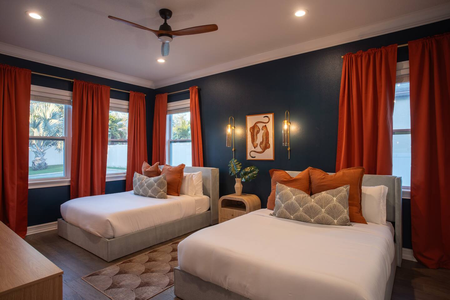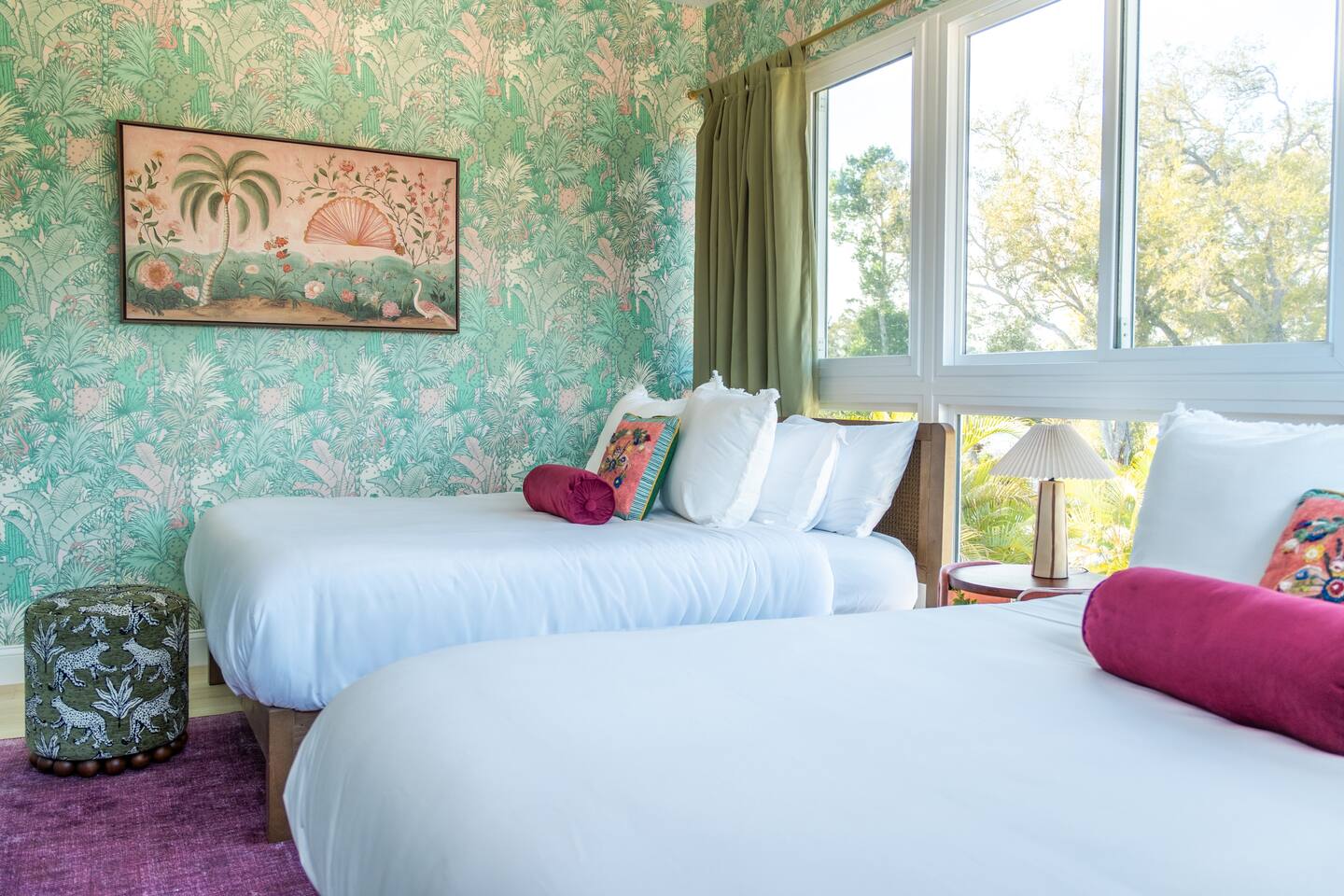 🛏️ Sleeping Arrangements- Sleeps up to 16-20 guests! Thoughtfully designed to give groups plenty of space to unwind. First Floor • Bedroom 1 — Two Queen beds with ensuite bathroom Second Floor • Bonus Bunk Area — Four Queen beds in bunk bed style • Bedroom 2 — King bed with ensuite bathroom • Bedroom 3 — Two Full beds • Bedroom 4 — Two Queen beds • Additional full guest bathroom Fresh linens, towels, and essentials are provided for every guest. 🐘The Estate Designed for comfort, style, and memorable group stays. • 2,700 sq ft two-story home • 4 bedrooms + spacious bunkbed bonus area • 3 full bathrooms (2 ensuite) • Elegant open-concept living spaces • Smart TVs (Roku + Google TV) • Climate-controlled garage lounge and game room • Samsung washer & dryer Rich finishes, warm lighting, and darker tones create a relaxed yet refined atmosphere perfect for gathering together. 🍽️ Chef-Ready Kitchen The fully equipped kitchen makes hosting effortless. • Keurig Duo (drip + single K-cup) • Toaster • Tea kettle • Blender • Air fryer • Full cookware set • Full glassware set • Refrigerator with filtered water & ice maker • Paper towels and essentials provided Perfect for group dinners, celebratory meals, or late-night snacks after a day by the pool. 🎮 Garage Lounge & Game Room A stylish entertainment space for relaxed evenings. • Billiards table • Poker table • Vintage-style record player with a collection of our favorite records • Climate-controlled comfort • Arcade machine located upstairs in the bunk suite room The perfect place for friendly games, music, and late-night conversations. 🌴 Private Backyard Oasis Step outside to your palm-lined outdoor retreat. • Heated pool (3–5 ft depth) • Sun shelf loungers in the pool • Outdoor pergola lounge • Outdoor dining seating for up to 6 • Projector screen for outdoor movies • 4-hole mini golf • Pickleball court • Basketball hoop • Cornhole • Giant Jenga • Propane fire table in the pergola • BBQ Grill and Utensils • Pool floats available 🏝️ Heated Pool – Additional Fee Required • Pool: $30/day and must be on at least 2 consecutive days • Pool Target Temp: 84-87°F 👶 Family Amenities • Pack-n-play • High chair • Kids utensils Baby amenities are located in the downstairs bedroom closet. 🏖️ Beach Day Essentials Located in the outdoor shed: • 6–8 beach chairs • Umbrella • Cooler • Beach wagon Beach towels are available in the patio cabinet and downstairs bedroom closet. 📍 Prime St. Petersburg Location Conveniently located in a quiet residential neighborhood of St. Petersburg, with easy access to some of the Gulf Coast’s best beaches, dining, and attractions. • 5 minutes to Madeira Beach • 15 minutes to St. Pete Beach • 6 minutes to Redington Beach • 9 minutes to John's Pass Village & Boardwalk • 30 minutes to St. Pete Pier and downtown St. Pete • 30 minutes to St. Pete–Clearwater International Airport • 45 minutes to Tampa International Airport 🚗 Parking • Driveway parking for 4–6 vehicles • Up to 2 additional vehicles with tandem parking • No street parking permitted 📌 House Rules Respecting the home ensures a wonderful stay for all guests. • Maximum occupancy: 20 guests • Quiet hours: 10 PM – 8 AM • No smoking or vaping • No open flames indoors • Thermostat must remain between 69°F and 78°F • No shoes inside the house • Use of pool and recreational equipment is at guest’s own risk • Please keep doors and windows closed to prevent pests • Report any damage promptly • Respect neighbors and the property at all times 🔒 Security For safety and property protection: • Exterior security cameras located at the front, side, and backyard of the home (no audio recording). The Palm Royale is perfect for elegant group getaways, celebrations, and memorable coastal retreats, where sun-drenched afternoons and glamorous evenings come together in true Florida style. 🌴✨