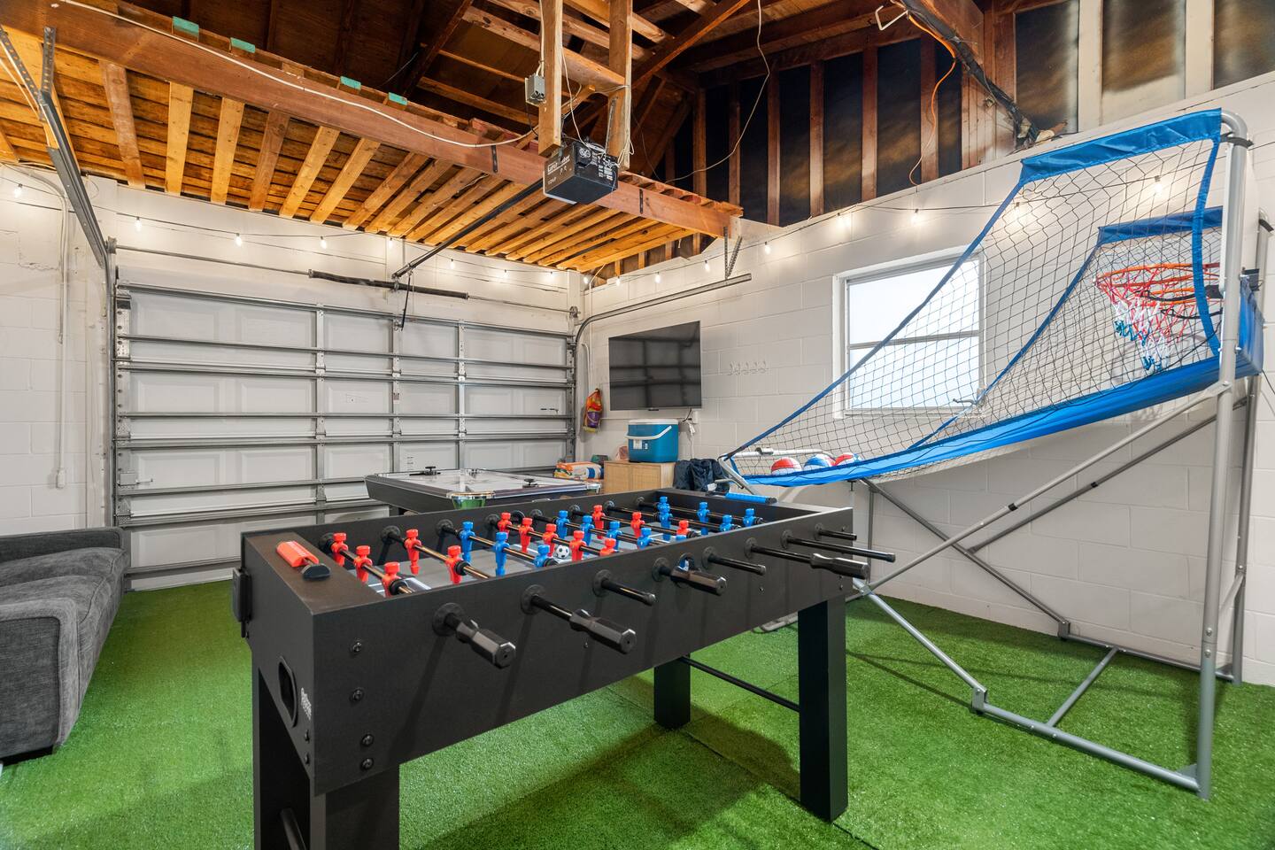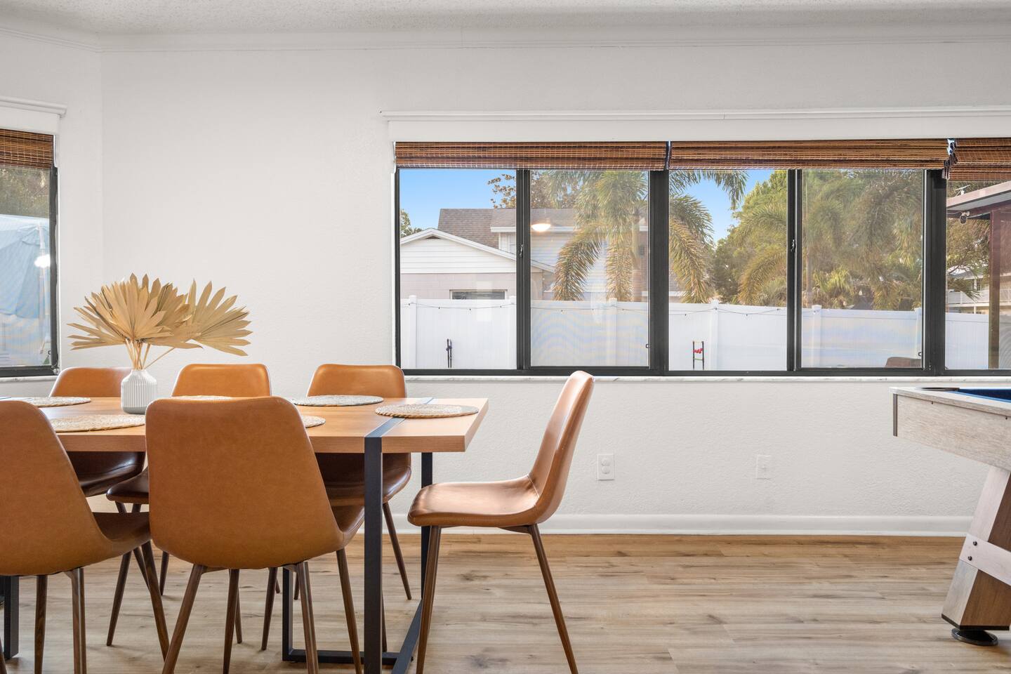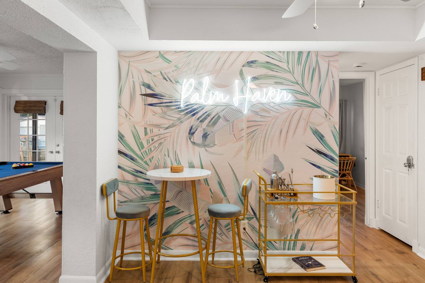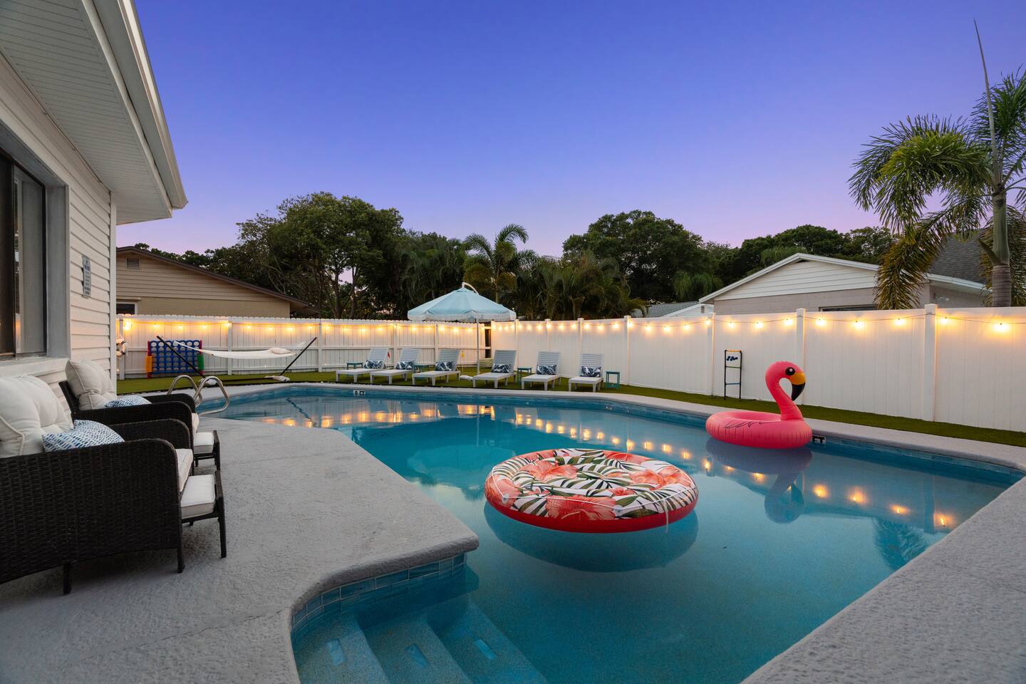 The Palm Haven offers 7 beds (3 King Beds, 2 Queen Beds, and 2 Twin Beds – Bunk/Trundle), comfortably sleeping up to 12 guests! 🛏️ Outside, enjoy a heated pool, plenty of seating, a grill, and a firepit. 🔥 Next to the pool, challenge your group to mini putt-putt, cornhole, 4-in-a-row, and more! Kids will love the outdoor playset/swingset, while the garage has air-hockey, billiards, card games, board games, and a 1v1 basketball shootout! 🏀 Only 2 miles from the beach, you’ll receive a beach kit and beach towels for your convenience! 🏖️ Laundry machines are also available, along with a coffee bar to start your day right! ☕ 🌟 Amenities • Yard Games & Board Games • Cornhole & Mini Putt-Putt • Outdoor Playset/Swingset for Kids • Air Hockey & 1v1 Basketball Shootout • Beach Kit (Loungers, Umbrella, Beach Toys) • Beach Towels • Billiards • Full Coffee Bar • Smart TVs (Roku) 🏝️ Heated Pool – Additional Fee Required • Pool heat: $30/day • Temperature set to 85F *can vary depend on external weather conditions 📌House Rules This home is equipped with outdoor security cameras 📸 as well as noise-detection hardware 🔊 (which does not record audio) that monitors high noise levels. Breaking any of the house rules—such as having unregistered guests, hosting parties, allowing unregistered pets🐾, engaging in illegal activity, smoking indoors, or violating quiet hours 🔕—can and will result in the immediate cancellation of your reservation without a refund💸. Neighbors are diligent in reporting any violations, so please be respectful of the property, the furnishings, quiet hours🌙, and the neighbors to ensure a positive stay! 😊 • Parties, events, and gatherings are strictly prohibited. • Quiet hours: 10 PM – 8 AM • No open flames, candles, or matches • No shoes inside the house – cleaning/replacement fees apply for stains • Thermostat must be set between 69°F and 78°F • Keep doors/windows closed to avoid pest entry (Florida is a tropical climate) Pet fee: Pet fee is $150 per stay for 1 pet, and $50 per each additional pet. Please limit your pets to 2 total. 🔥 Please note: Due to Florida’s tropical climate 🌴 and related storage concerns, we do not provide firewood for the firepit. 🪵 Firewood can be conveniently purchased at nearby supermarkets 🛒 or hardware stores 🛠️. We’ve thoughtfully prepared this home to offer both fun and relaxation for your family or group. Enjoy every moment—indoors and out!🙂