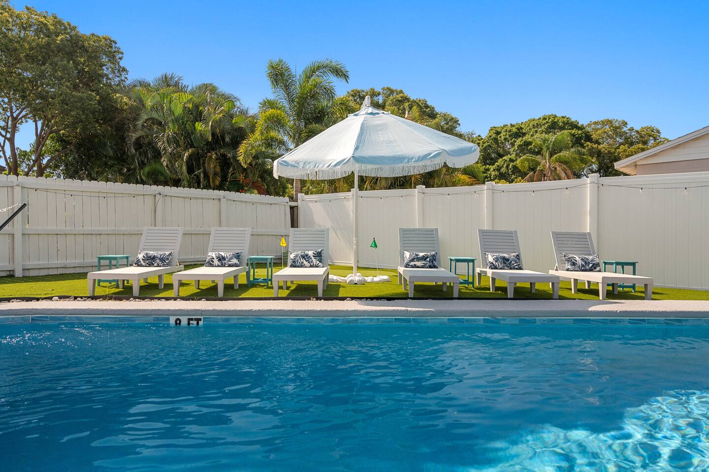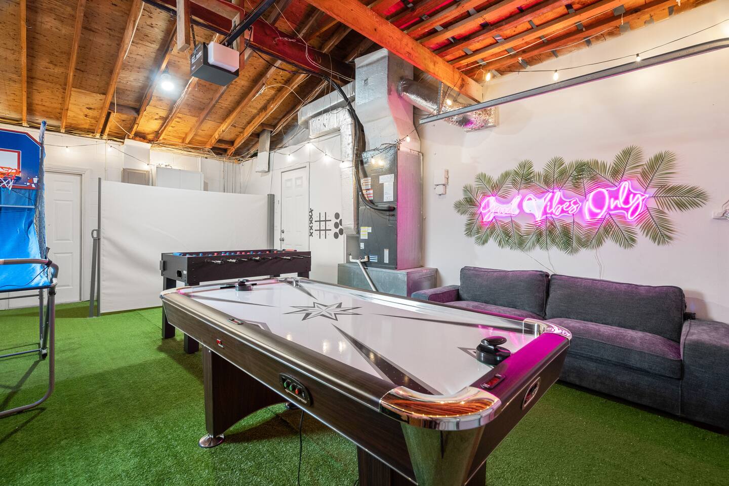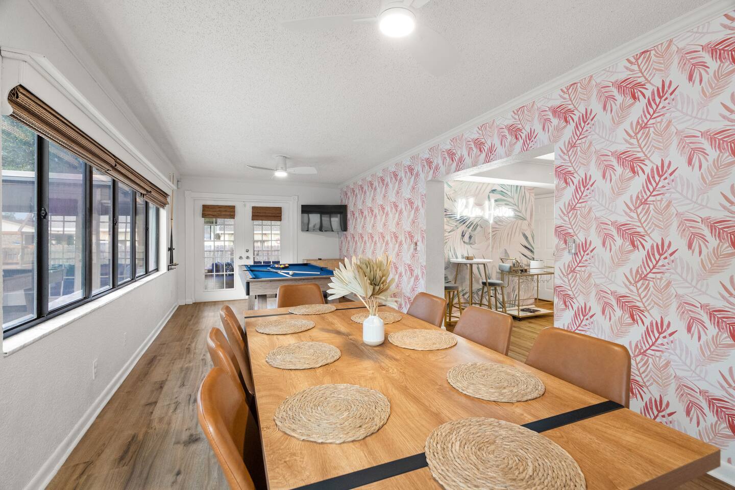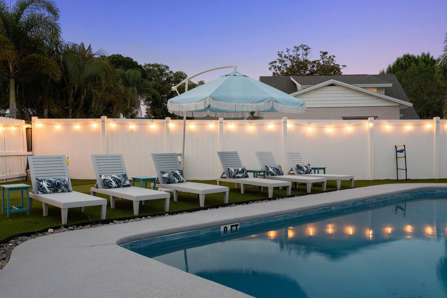 The Palm Haven offers 7 beds (3 King Beds, 2 Queen Beds, and 2 Twin Beds – Bunk/Trundle), comfortably sleeping up to 12 guests! 🛏️ Outside, enjoy a heated pool, plenty of seating, a grill, and a firepit. 🔥 Next to the pool, challenge your group to mini putt-putt, cornhole, 4-in-a-row, and more! Kids will love the outdoor playset/swingset, while the garage has air-hockey, billiards, card games, board games, and a 1v1 basketball shootout! 🏀 Only 2 miles from the beach, you’ll receive a beach kit and beach towels for your convenience! 🏖️ Laundry machines are also available, along with a coffee bar to start your day right! ☕ 🌟 Amenities • Yard Games & Board Games • Cornhole & Mini Putt-Putt • Outdoor Playset/Swingset for Kids • Air Hockey & 1v1 Basketball Shootout • Beach Kit (Loungers, Umbrella, Beach Toys) • Beach Towels • Billiards • Full Coffee Bar • Smart TVs (Roku) 🏝️ Heated Pool – Additional Fee Required • Pool heat: $30/day • Temperature set to 85F *can vary depend on external weather conditions 📌House Rules This home is equipped with outdoor security cameras 📸 as well as noise-detection hardware 🔊 (which does not record audio) that monitors high noise levels. Breaking any of the house rules—such as having unregistered guests, hosting parties, allowing unregistered pets🐾, engaging in illegal activity, smoking indoors, or violating quiet hours 🔕—can and will result in the immediate cancellation of your reservation without a refund💸. Neighbors are diligent in reporting any violations, so please be respectful of the property, the furnishings, quiet hours🌙, and the neighbors to ensure a positive stay! 😊 • Parties, events, and gatherings are strictly prohibited. • Quiet hours: 10 PM – 8 AM • No open flames, candles, or matches • No shoes inside the house – cleaning/replacement fees apply for stains • Thermostat must be set between 69°F and 78°F • Keep doors/windows closed to avoid pest entry (Florida is a tropical climate) Pet fee: Pet fee is $150 per stay for 1 pet, and $50 per each additional pet. Please limit your pets to 2 total. 🔥 Please note: Due to Florida’s tropical climate 🌴 and related storage concerns, we do not provide firewood for the firepit. 🪵 Firewood can be conveniently purchased at nearby supermarkets 🛒 or hardware stores 🛠️. We’ve thoughtfully prepared this home to offer both fun and relaxation for your family or group. Enjoy every moment—indoors and out!🙂