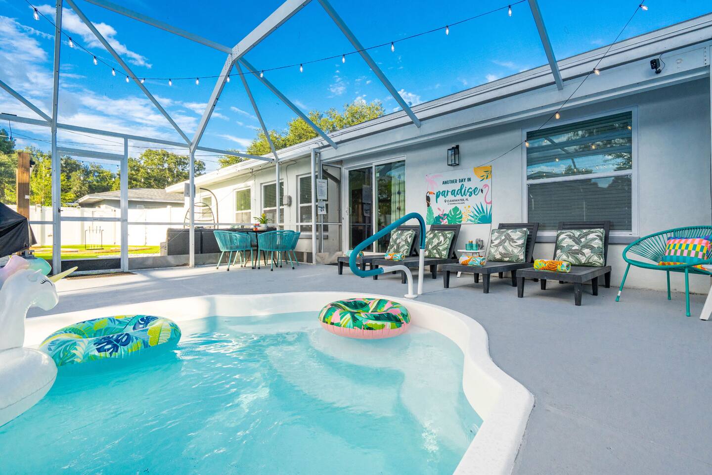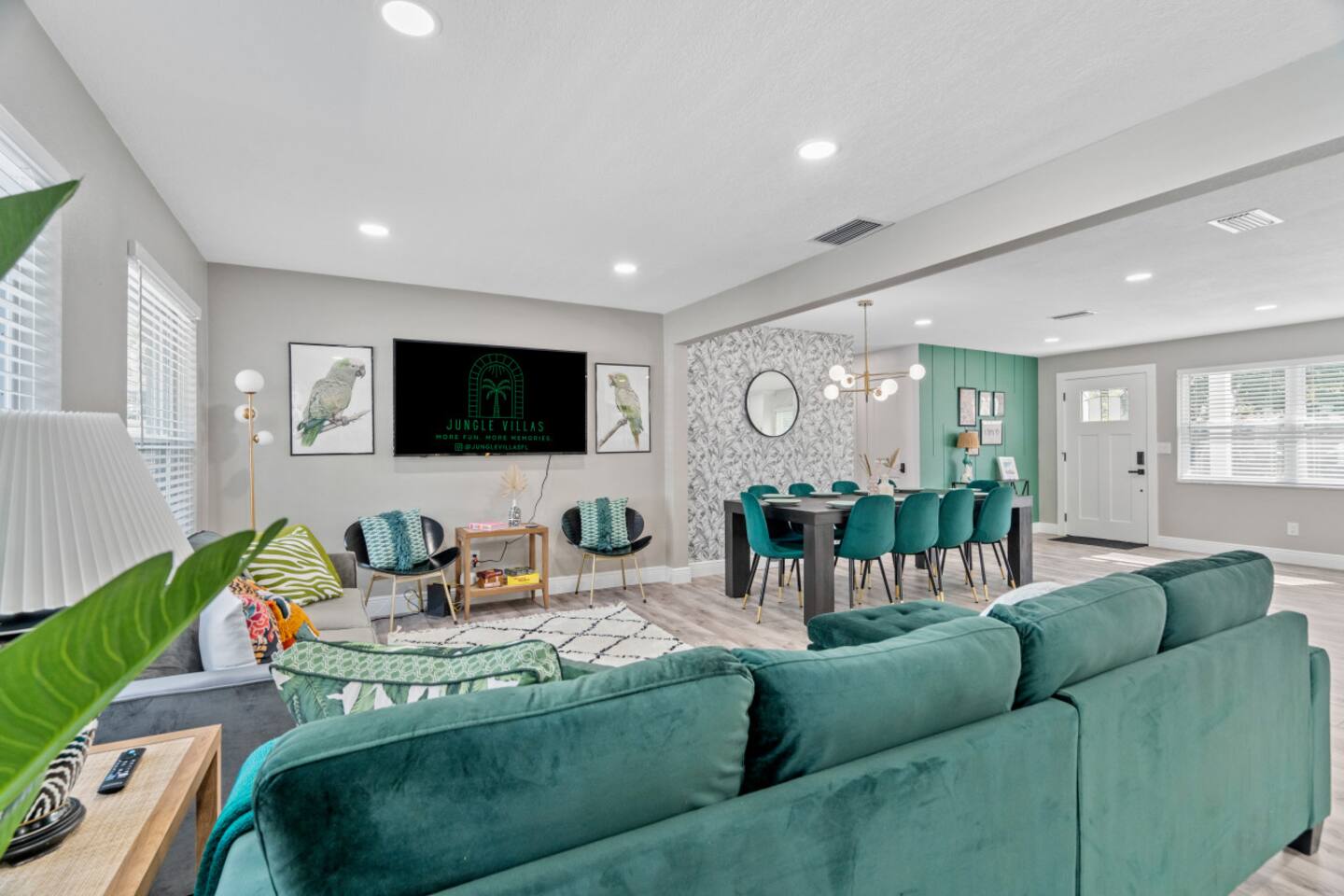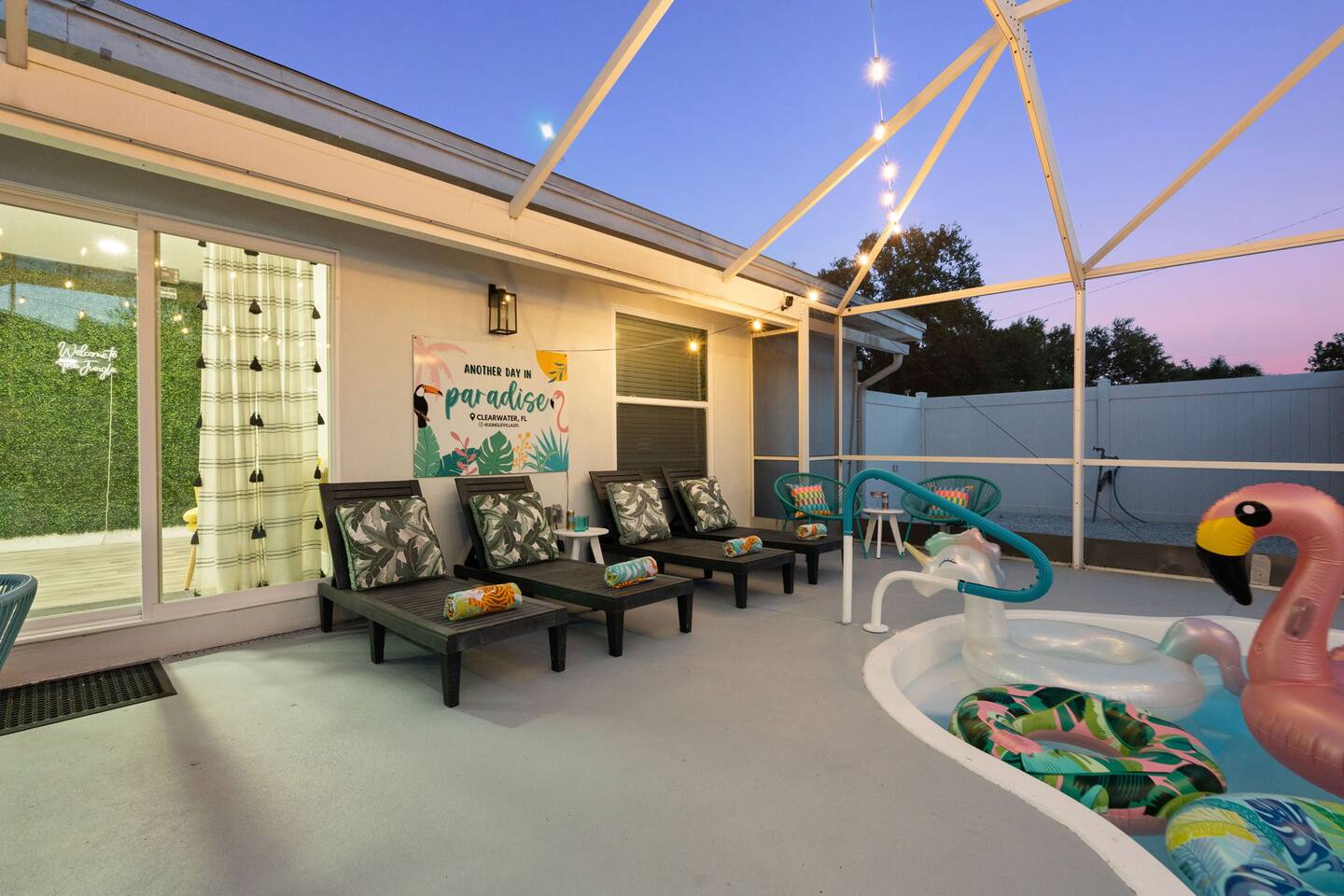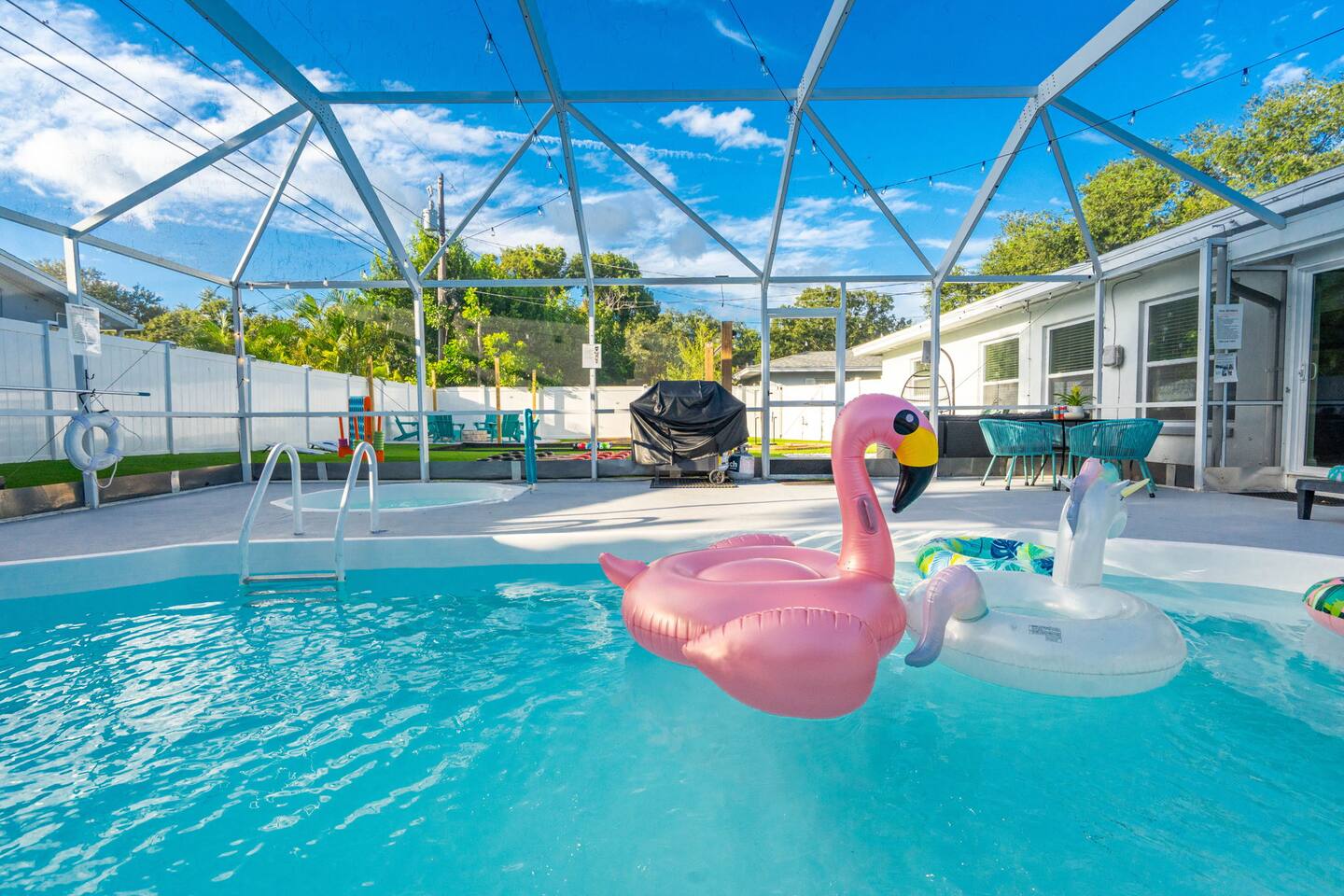 The Jungle Villa has 8 beds (2 king beds + 2 full-size bunks with twin trundles) and sleeps up to 12 guests! 💤✨ Enjoy a heated pool and hot tub with loungers, seating, and a grill — perfect for sunny days! ☀️🍹 Play Minigolf, Cornhole, or our exclusive Kick-Billiards by the pool. 🎯 At night, relax with a movie on the outdoor projector 🎬 or hit the game room for Ping Pong, Poker, Foosball, Card Games, and a 1v1 Basketball Shootout! 🏓🏀 You're just 12 minutes to Clearwater Beach 🏖️ — and we’ve got your Beach Kit ready with loungers, umbrella, and toys! Before heading out, grab a boost from our stocked Coffee Bar! ☕ 🌟 Amenities • Heated Pool & Hot Tub (additional fees apply) • Mini Golf • Soccer Billiards • Giant Yard Games • Firepit • Outdoor Projector & Movie Area • Ping Pong, Foosball, Poker Table, 1v1 Basketball Shootout • Beach Kit (loungers, 1 umbrella, beach toys) • Beach/Pool Towels • Full Coffee Bar • Smart TVs (Amazon Fire TV) 🏝️ Heated Pool & Hot Tub – Additional Fee Required • Pool heat: $35/day • Hot tub: $25/day • Both: $50/day (applied to entire reservation) 📌House Rules This home is equipped with outdoor security cameras 📸 as well as noise-detection hardware 🔊 (which does not record audio) that monitors high noise levels. Breaking any of the house rules—such as having unregistered guests, hosting parties, allowing unregistered pets🐾, engaging in illegal activity, smoking indoors, or violating quiet hours 🔕—can and will result in the immediate cancellation of your reservation without a refund💸. Neighbors are diligent in reporting any violations, so please be respectful of the property, the furnishings, quiet hours🌙, and the neighbors to ensure a positive stay! 😊 📏 Please Note – House Rules Respecting the space ensures a smooth and enjoyable stay. Violation of these rules may result in immediate cancellation without refund: Pet fee: Pet fee is $150 per stay for 1 pet, and $50 per each additional pet. Please limit your pets to 2 total. • Parties, events, and gatherings are strictly prohibited. • Quiet hours: 10 PM – 8 AM • No open flames, candles, or matches • No shoes inside the house – cleaning/replacement fees apply for stains • Thermostat must be set between 69°F and 78°F • Keep doors/windows closed to avoid pest entry (Florida is a tropical climate) We’ve thoughtfully prepared this home to offer both fun and relaxation for your family or group. Enjoy every moment—indoors and out!🙂