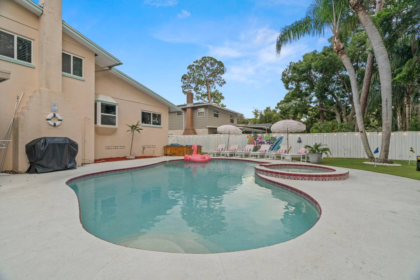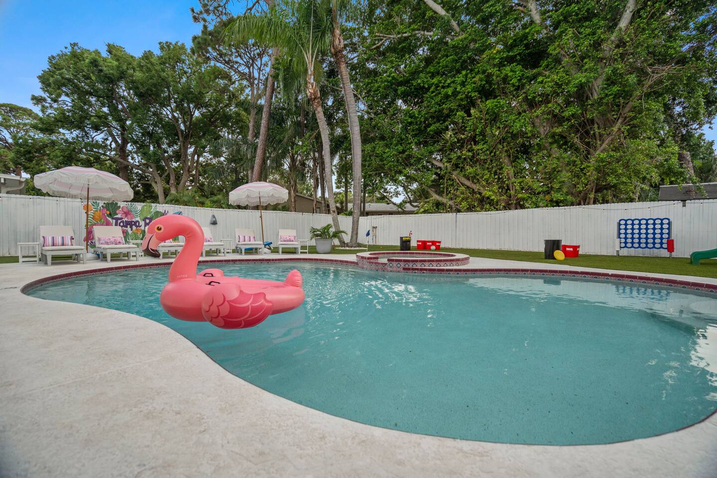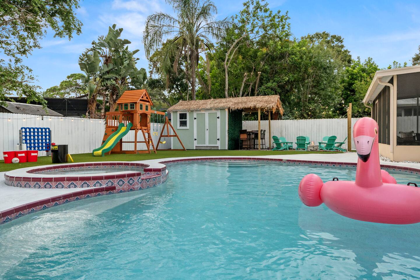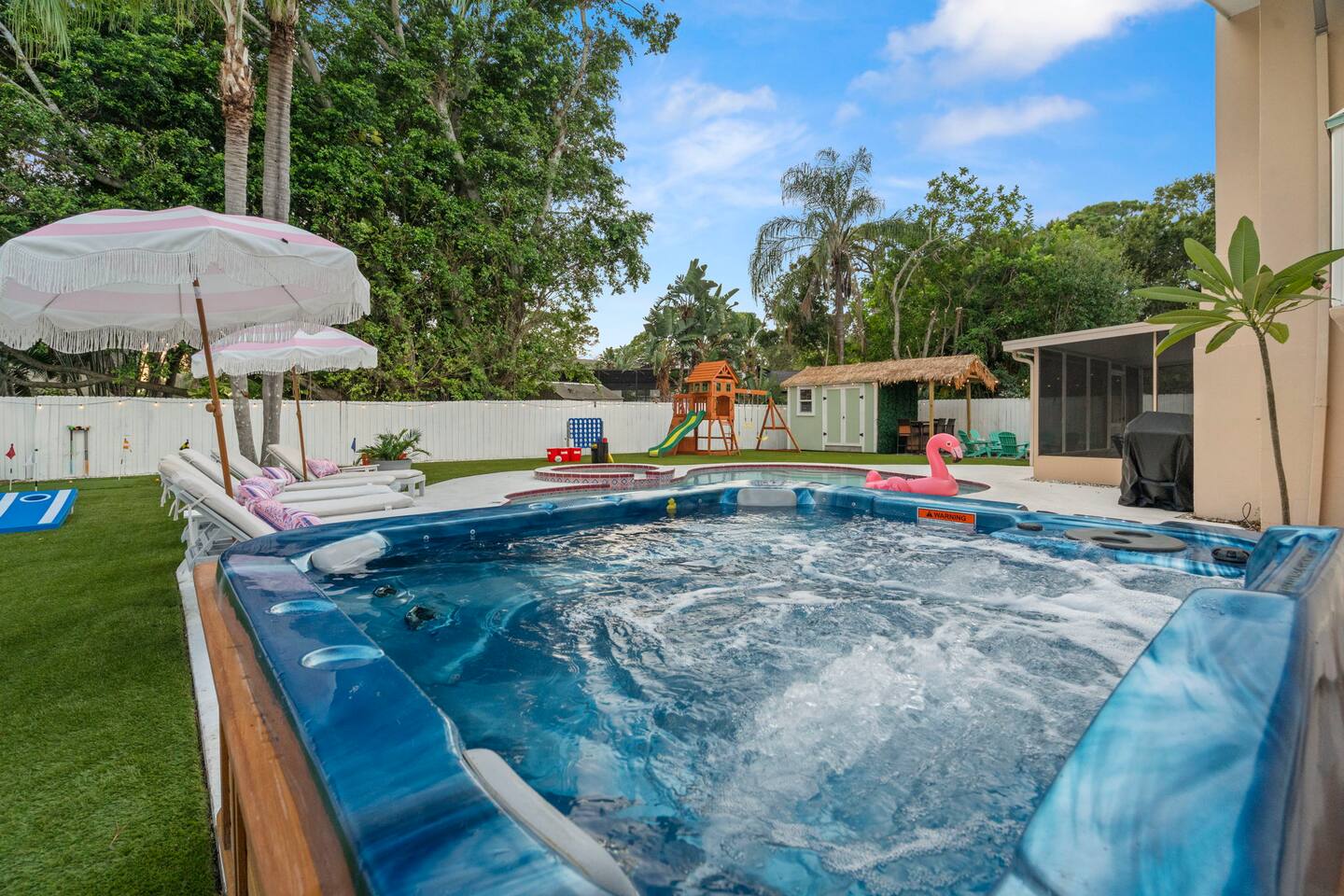 Spend your vacation at this fun-filled home in Seminole, just a 5 minute drive to the world-renowned white sand beaches! Comfortably sleeps up to 16 guests and is perfect for your Florida getaway! Enjoy a heated pool and hot tub, outdoor dining, a tiki cabana, and a grill — perfect for sunny days! ☀️🍹 Play a round of Mini golf, Cornhole, Yard pong or Kanjam by the pool. 🎯 And at night, roast marshmallows at the firepit, chill in the hot tub, or hit the game room for a Nintendo tournament! You're a short drive to the famous white sand beaches — and we’ve got your Beach Kit ready with loungers, umbrella, and cooler! 🌟 Amenities • Heated Pool • Hot tub • Mini Golf • Outdoor bowling • Billiards • Nintendo Switch and board games • Foosball and Skeeball • Basketball pop-a-shot • Home gym with cable machines and Peloton • Yard Games (Kanjam, Yard pong, cornhole, Bocce ball and connect 4) • Fire pit • Beach Kit (loungers, snorkel, body boards, umbrella, cooler) • Beach Towels • Coffee Bar • Smart TVs 🏝️ Heated Pool and Hot Tub – Additional Fees Required • Pool heat: $30/day • Hot Tub heat: $25/day • Both for a bundle price of $50! 📌House Rules Respecting the space ensures a smooth and enjoyable stay. Violation of these rules may result in immediate cancellation without refund: • No parties or events • Quiet hours are from 10 pm-8 am • No unregistered guests • No smoking • No open flames, candles, or matches • No shoes inside the house – cleaning/replacement fees apply for stains • Thermostat must be set between 69°F and 78°F • Keep doors/windows closed to avoid pest entry (Florida is a tropical climate) This home is equipped with outdoor security cameras 📸 as well as noise-detection hardware 🔊 (which does not record audio) that monitors high noise levels. Breaking any of the house rules—such as having unregistered guests, hosting parties, allowing unregistered pets🐾, engaging in illegal activity, smoking indoors, or violating quiet hours 🔕—can and will result in the immediate cancellation of your reservation without a refund💸. Neighbors are diligent in reporting any violations, so please be respectful of the property, the furnishings, quiet hours🌙, and the neighbors to ensure a positive stay! 😊 We’ve thoughtfully prepared this home to offer both fun and relaxation for your family or group. Enjoy every moment—indoors and out!🙂 The check-in instructions will be sent to you a day before your arrival 📅, so you'll have a clear guide to help with your check-in process 🏡. Similarly, the check-out instructions will be sent a day before your departure 🕒 to ensure a smooth check-out 🚪. If you need an early check-in ⏰ or late check-out 🛏️, please inform us ahead of time so we can check availability. Please note, this request is not guaranteed and depends on availability 🔄. We’re here to ensure you have a comfortable and enjoyable stay! 😊 If you need anything during your time here, don’t hesitate to reach out. Whether it’s recommendations, assistance with the property, or any special requests, we’re just a message away 📱. Pet fee: Pet fee is $150 per stay for 1 pet, and $50 per each additional pet. Please limit your pets to 2 total. Please note, we're happy to help during business hours, but in case of emergencies, we’re available 24/7 🚨. Please take a moment to carefully read the house rules 🏡 and any additional rules that may apply 🔑. These guidelines are in place to ensure a smooth and pleasant stay for everyone. If you have any questions or need clarifications, feel free to message us anytime 📩. We're here to help and make sure everything is clear!🙂