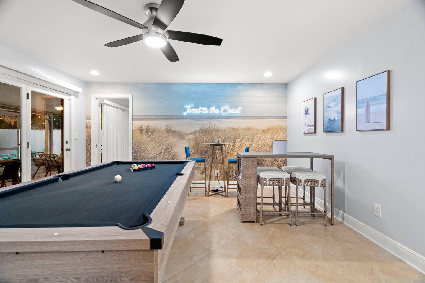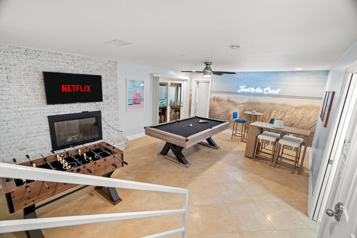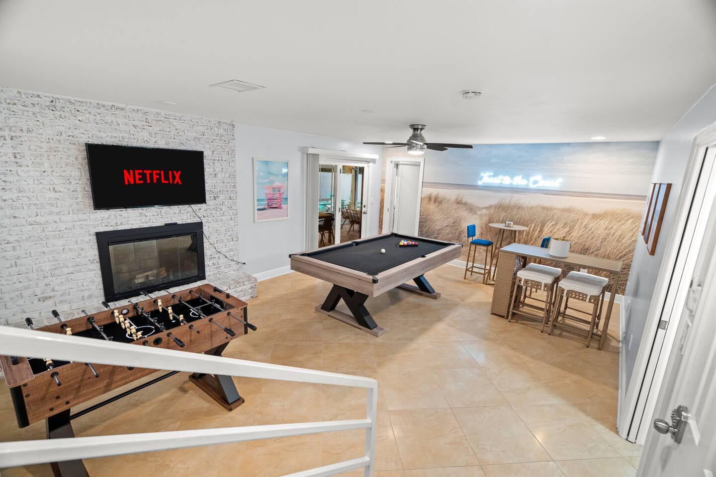 Soak up the Florida sunshine at The Coastal Charm- a 5 bedroom, 3 bathroom home that sleeps 16! With an indoor game room and Nintendo Switch, billiards table, and commercial workout equipment - this home has something for the whole family! This 5-bedroom home offers 9 beds: • 1 King in the downstairs suite • 1 King in an upstairs guest bedroom • 2 Queens in the upstairs suite • 1 King in an upstairs guest bedroom • Queen over queen and twin over twin bunk in an upstairs guest bedroom