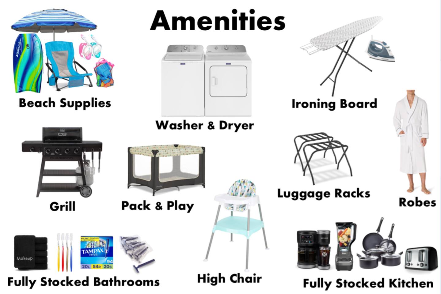 - Essentials Towels, bed sheets, soap, toilet paper, and pillows