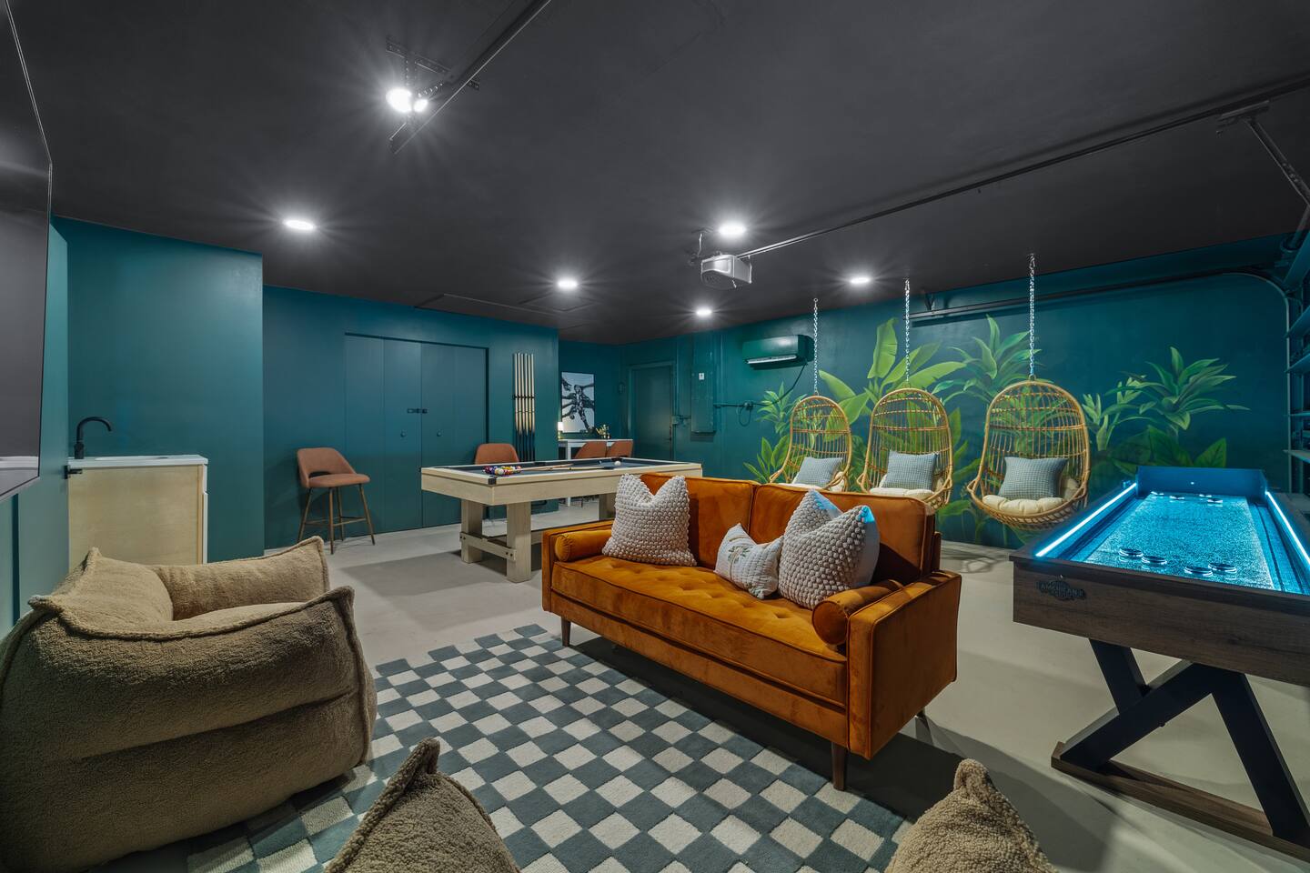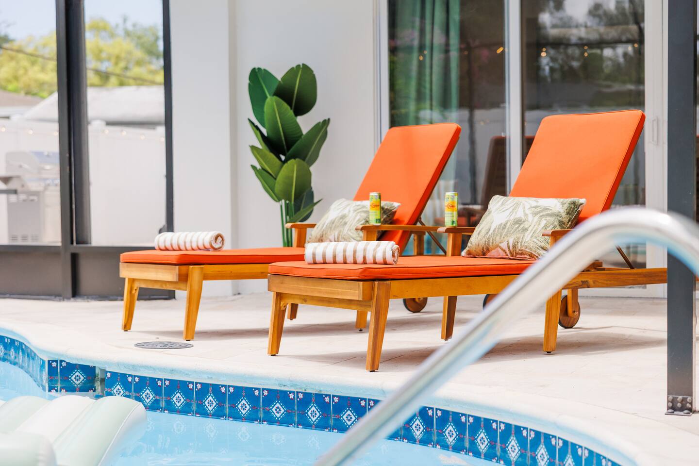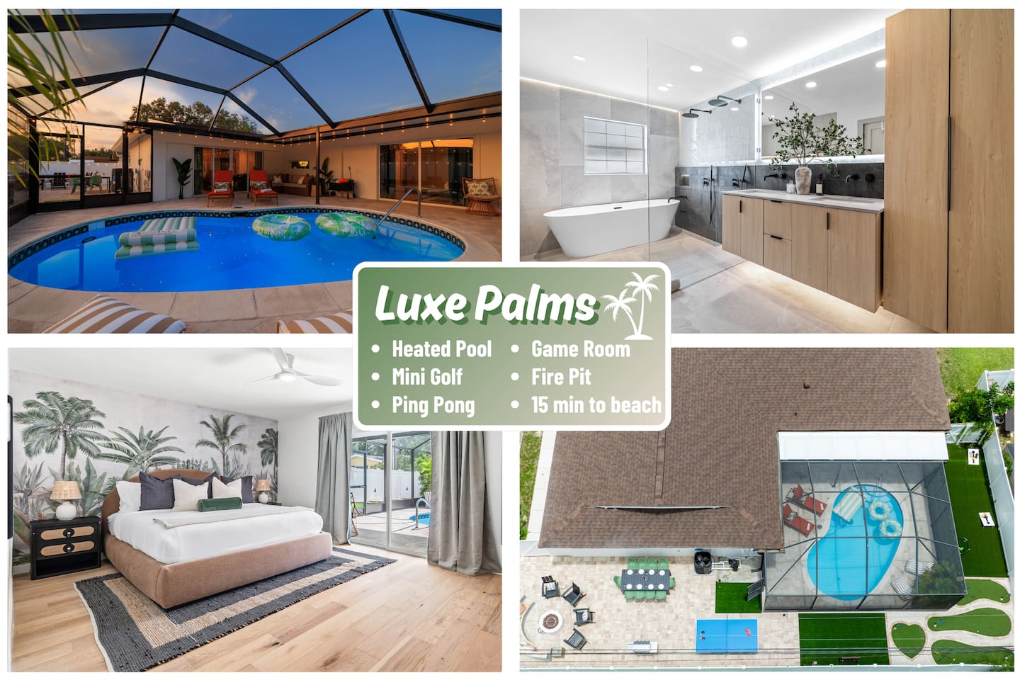 Unwind in style at the Luxe Palms- a modern villa packed with custom design, amenities, and fun! This 4 bedroom, 2 bathroom home can sleep up to 10 people. Enjoy the Florida sunshine in the heated pool, challenge your group to a game of mini golf, make smore's at the firepit or enjoy the world-famous beaches that are just a short drive away. With an indoor game room, spa-like custom designed bathrooms, this home has something for the whole family!